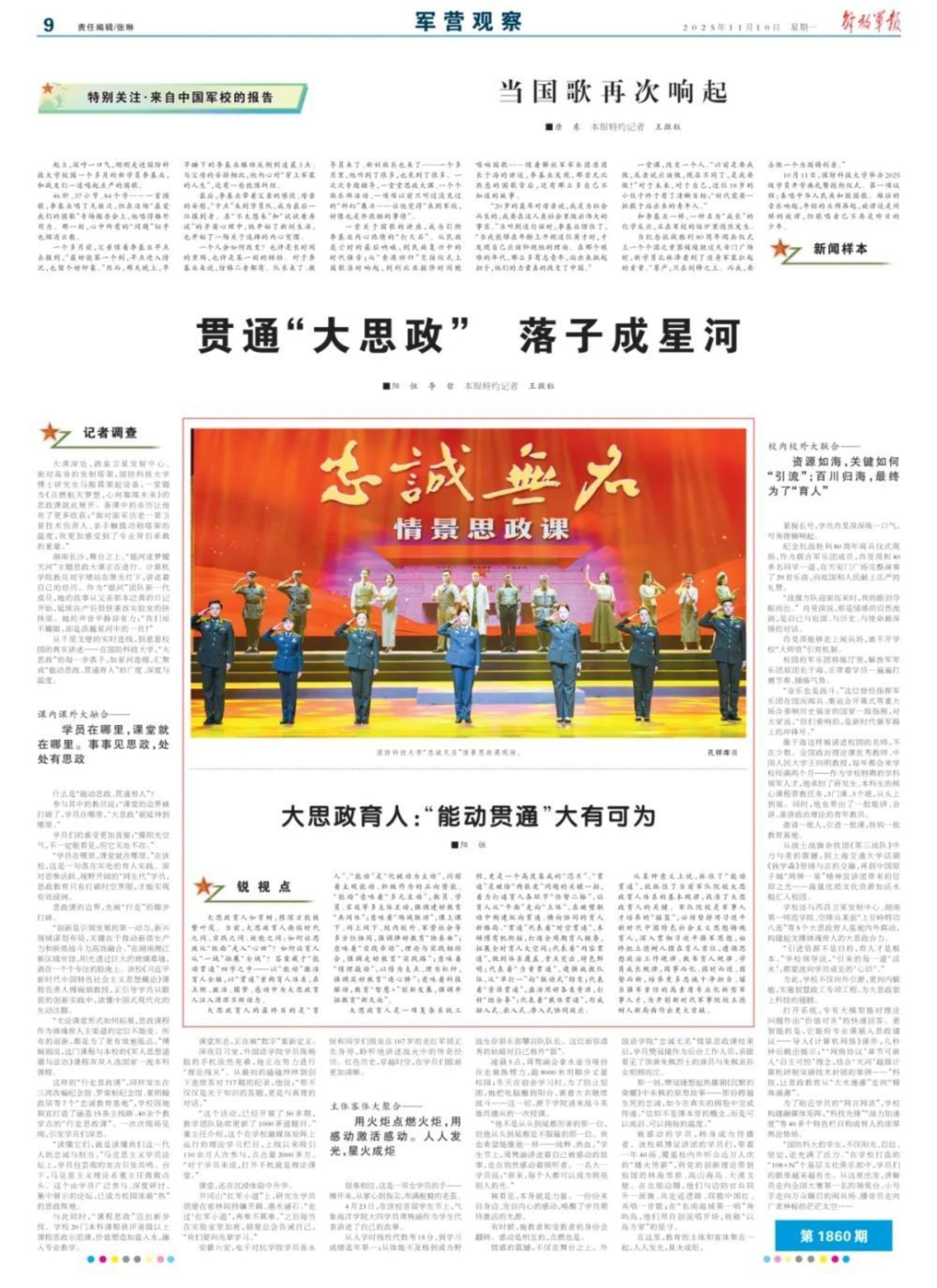国歌点燃青春信念,思政课重塑人生坐标。今天,《解放军报》整版聚焦国防科技大学“能动思政、贯通育人”大思政育人体系实践,阐释新时代 “大思政育人” 的深刻内涵。一个个年轻学员的蜕变,印证着思政教育的温度与力量。