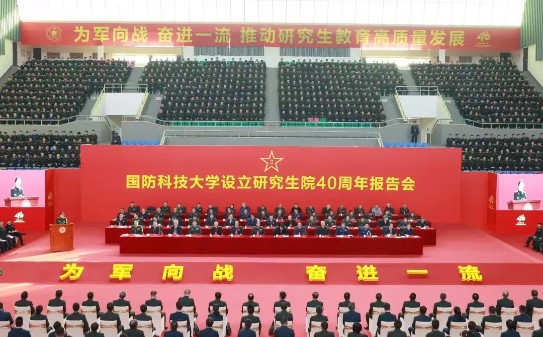 12月14日上午,国防科技大学设立研究生院40周年报告会在长沙校区一号院体育馆举行。学校校长黎湘作《为军向战、奋进一流,推动研究生教育高质量发展》主题报告,政治委员陈国强主持大会。