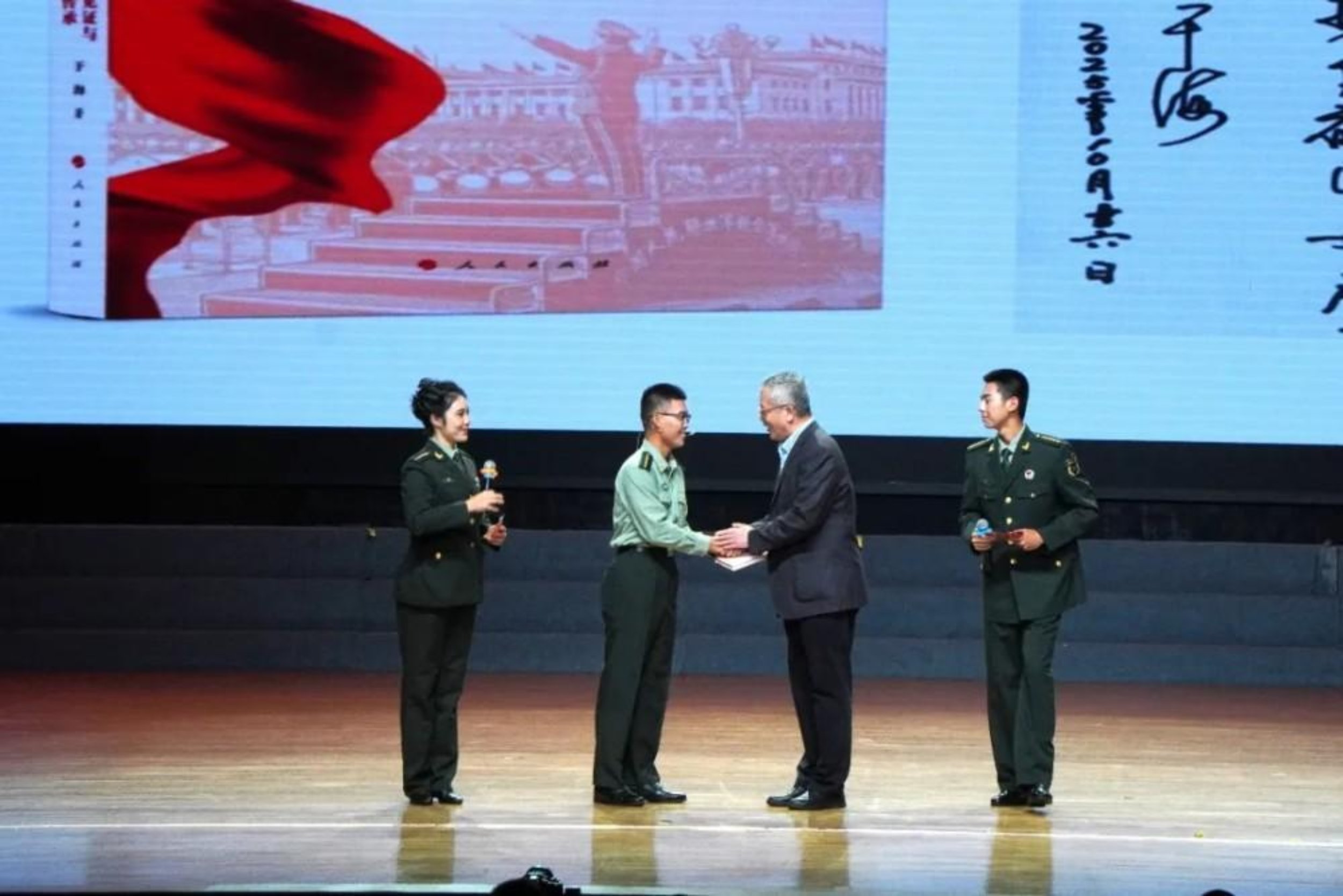 当我站上舞台,看到台下战友们的笑脸,内心的喜悦已经冲刷掉上台所有的紧张不安的情绪。想起这段时间以来的彩排,每一次,让我对于这个主题和故事,都有更深刻的体会和感悟,更让我感到无比激动的是,于海老师今天来到了现场,出乎我们所有人意料!他还把《国歌响起》这本书送给了我,让我倍感荣幸和感动,更深刻感受到了国歌对于每一个中国人的强大感召力量,我将不负期望,奋勇向前!