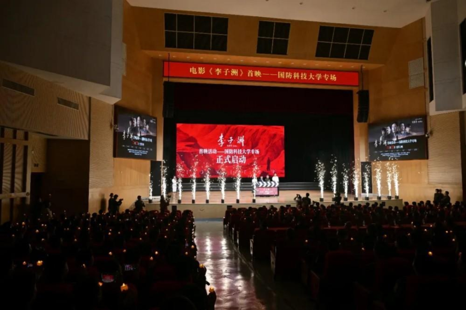 启动仪式中,致公党湖南省委有关领导、学校政治工作部相关领导,电影主创团队与全场嘉宾及观众共同点亮烛火。点点烛光与舞台冷焰火交织辉映,瞬间点燃全场。
