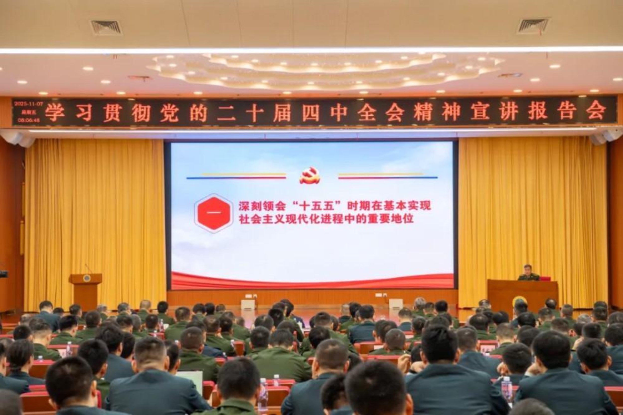宣讲现场,全军宣讲团成员陆军工程大学曹二刚教授、空军航空大学褚当阳教授,以全军宣讲提纲为依据,系统阐释了“十五五”时期的重要地位、方针目标、战略任务、根本保证,以及国防和军队现代化的重要部署。报告深入透彻、内容丰富、重点突出,既有对全会精神的凝练概括,又有联系实际、回应关切的生动解读,具有很强的思想性、针对性和实践性,教育引导师生员工把思想和行动统一到全会精神上来,汇聚起强国强军的强劲动力。
