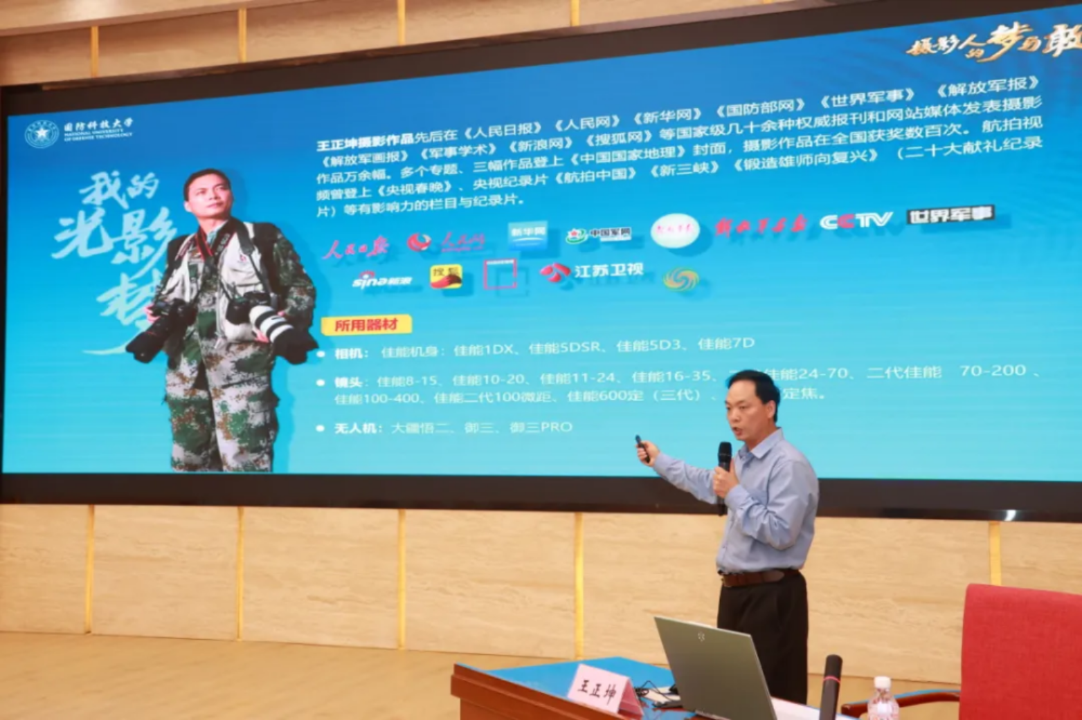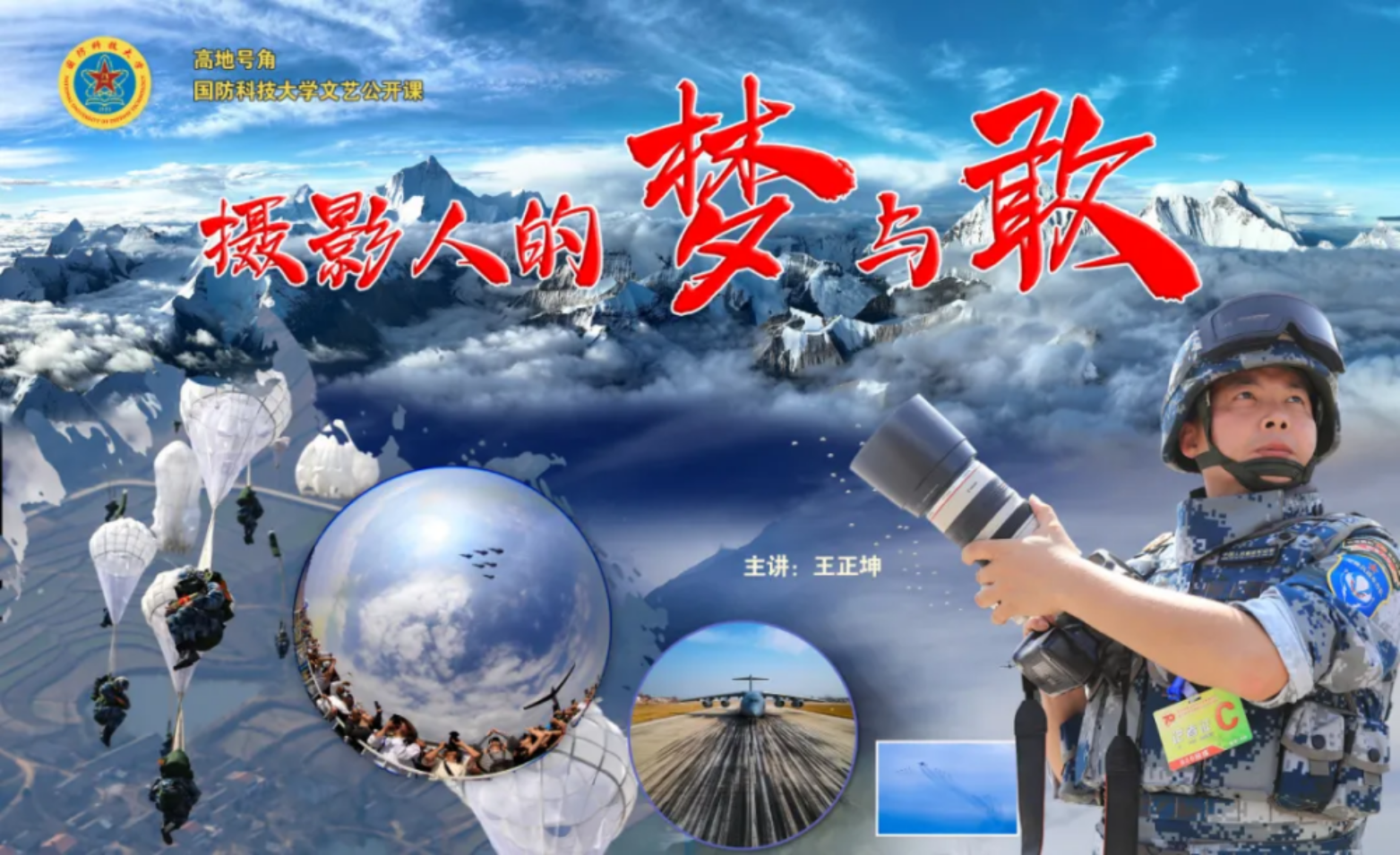 以蓝天为画布,以山河为诗行。这是怎样的一幅图景?4月19日,被誉为“中国高空摄影第一人”的王正坤老师来到国防科技大学,以开讲座、办个展等形式,深入解析军事摄影的精神密码。这是学校加强高地文化建设,推动科技教育与人文教育深度协同,以光影魅力激发强军活力的系列活动之一。学校政委陈国强出席活动,并为王正坤颁授高地文化大使荣誉证。