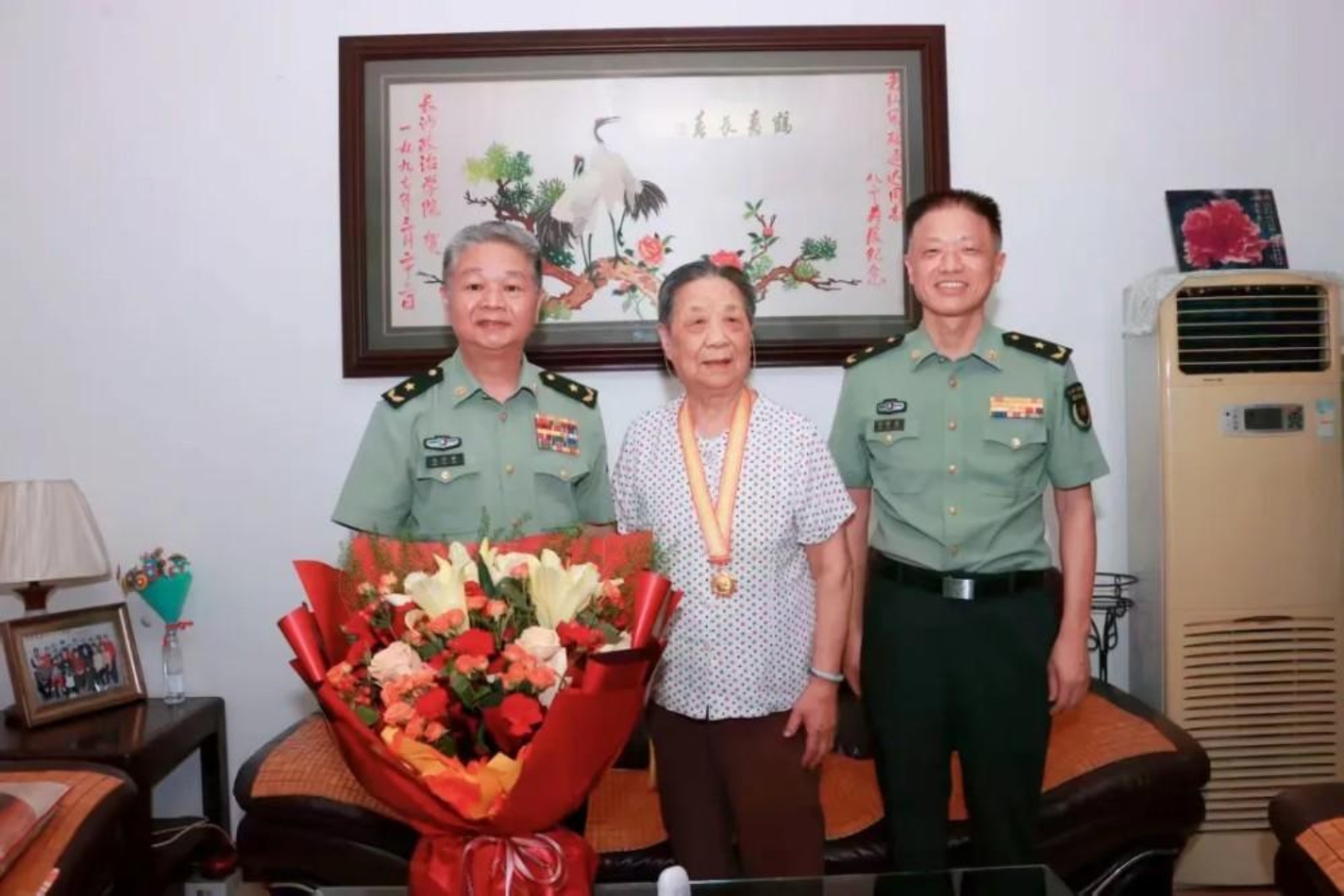 在纪念中国人民抗日战争胜利暨世界反法西斯战争胜利80周年之际,8月28日下午,受校长黎湘、政委陈国强委托,学校政治工作部领导会同前沿交叉学科学院主要领导,代表校党委、校首长专程看望慰问抗战老同志陶幼贫,颁发以中共中央、国务院、中央军委名义授予的“中国人民抗日战争胜利80周年”纪念章,并向她致以崇高敬意和诚挚问候。