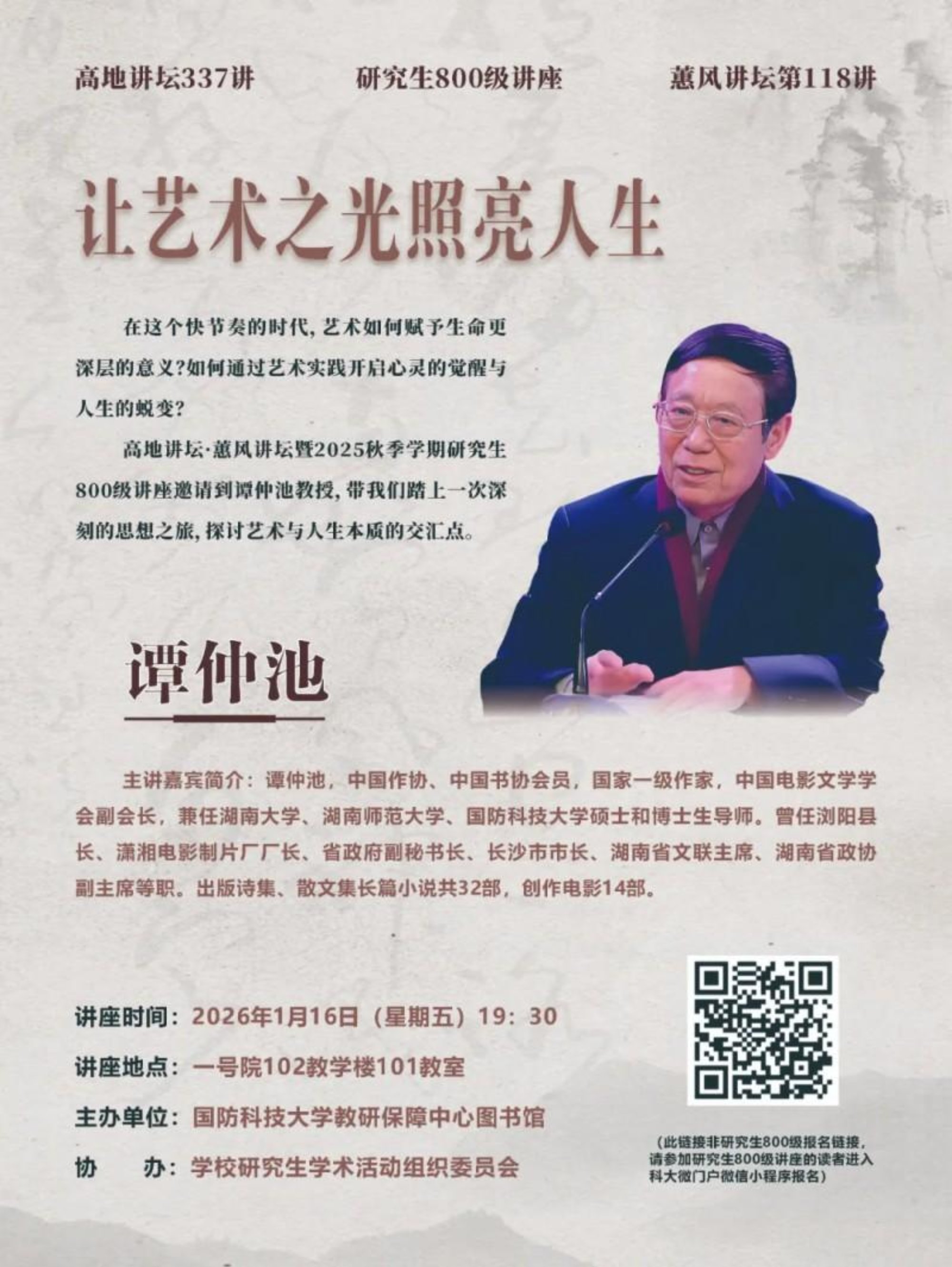 1月9日,高地讲坛第335讲学术活动在长沙校区一号院102教学楼101教室举行。《军履回望》作者张明刚将军作“朋友,让我们一起读书吧”主题报告。本次活动由教研保障中心图书馆举办,110余名学校师生参加。