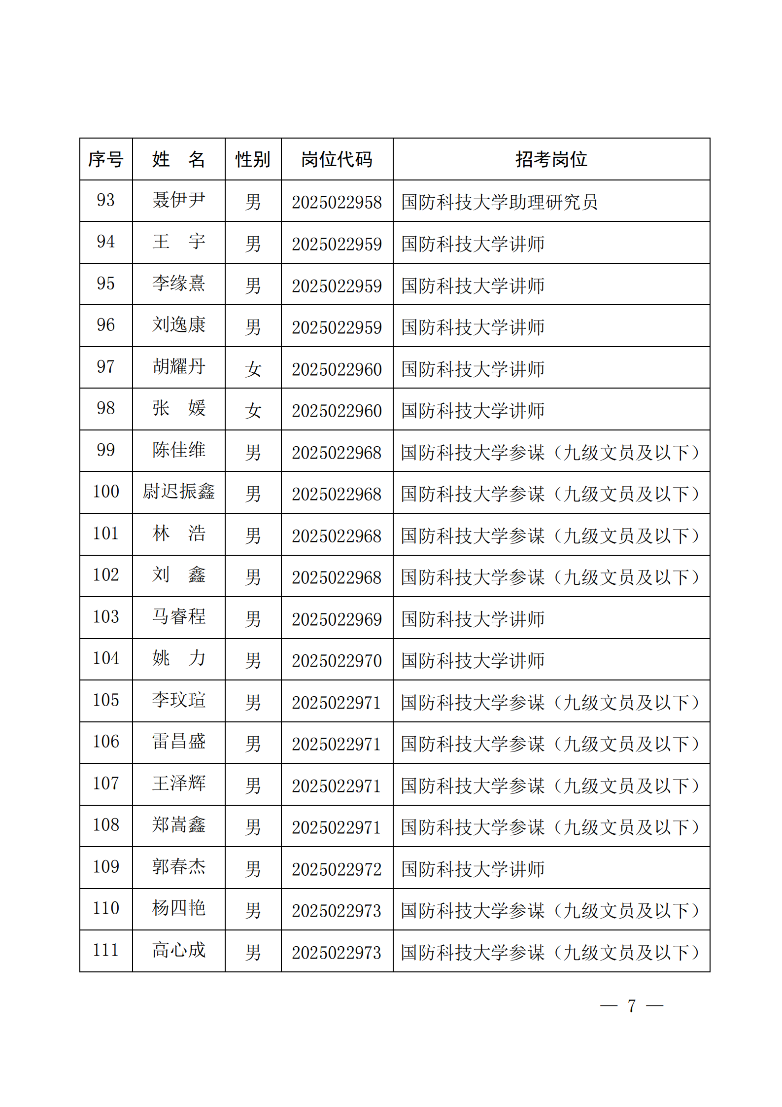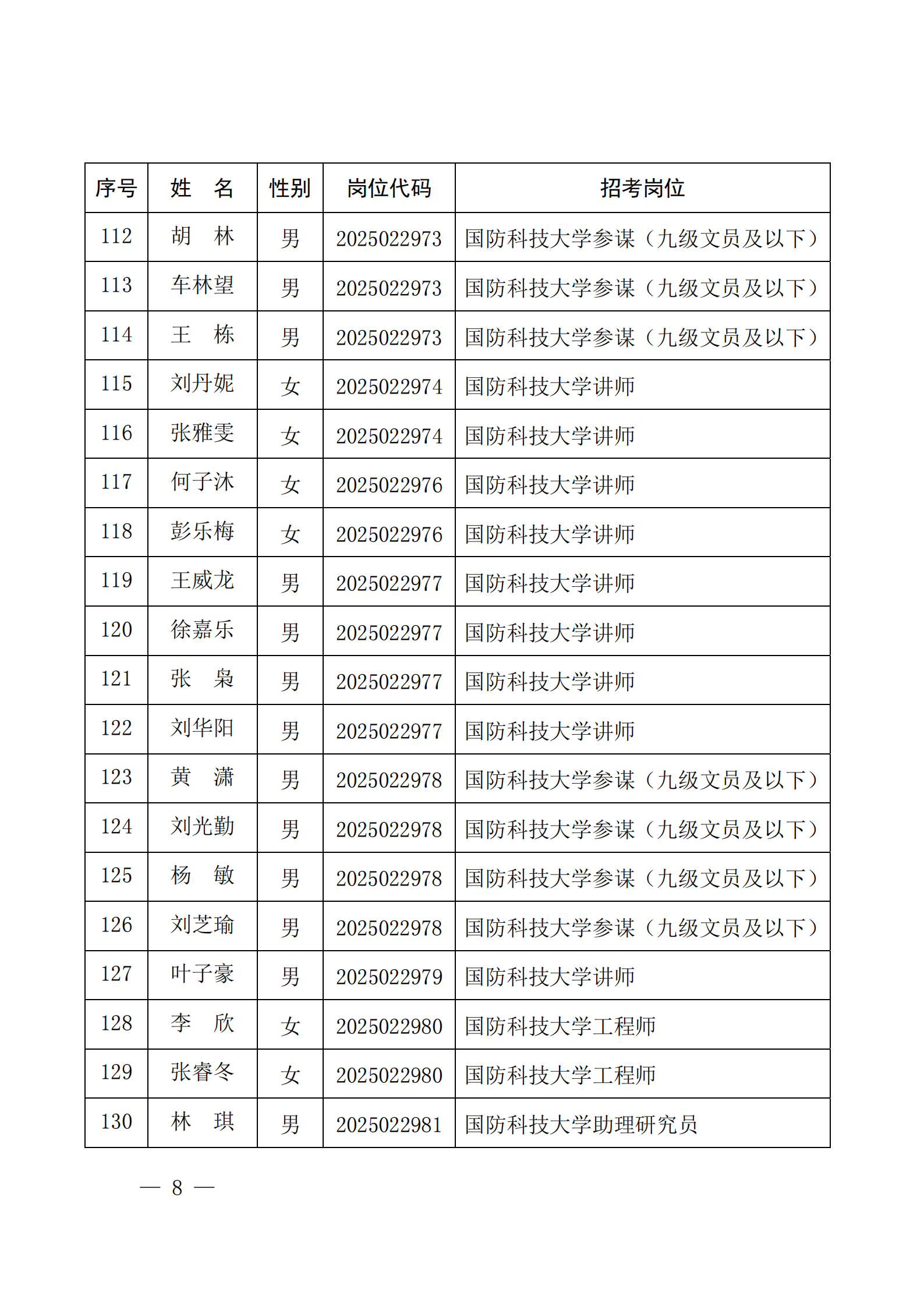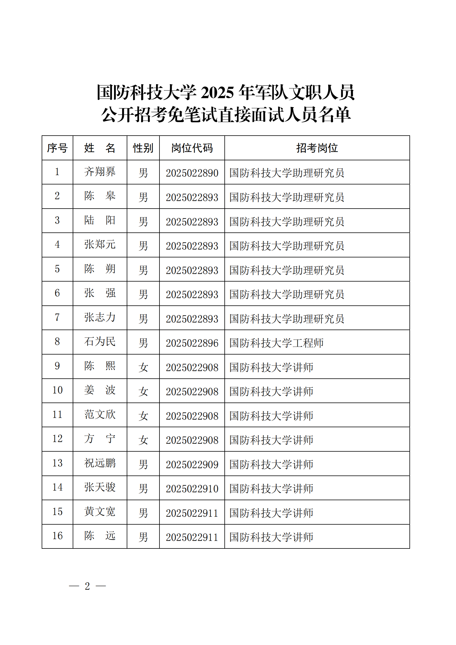 公示国防科技大学2025年军队文职人员公开招考免笔试直接面试人员名单