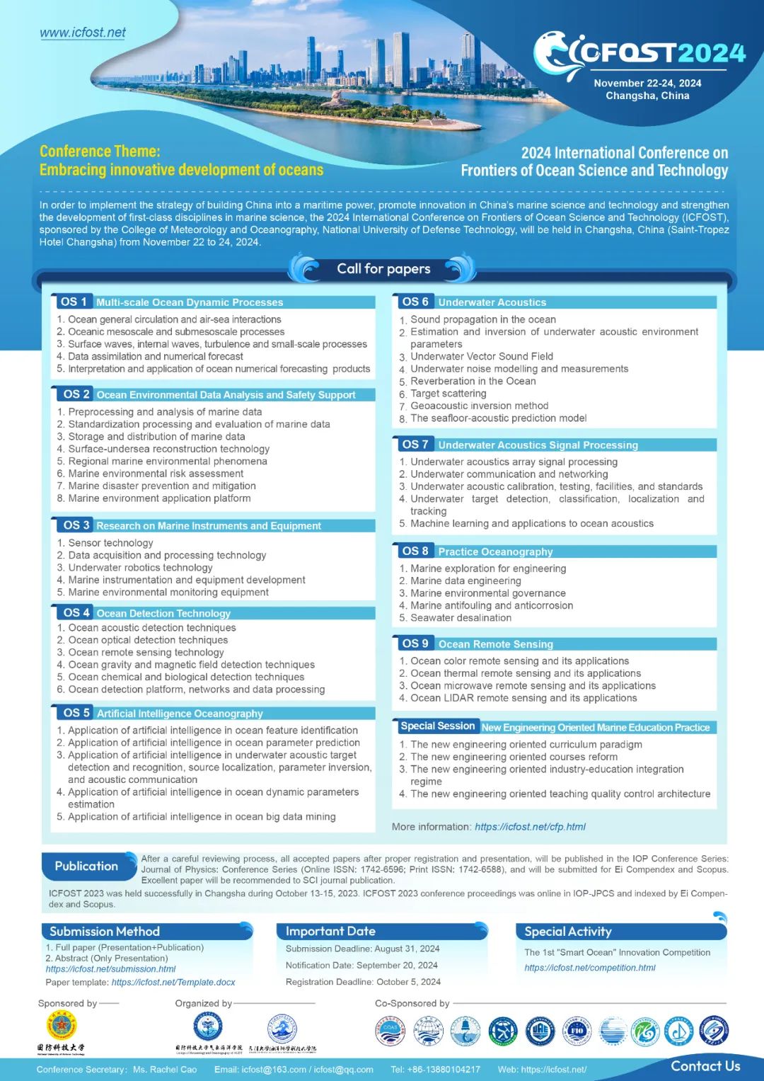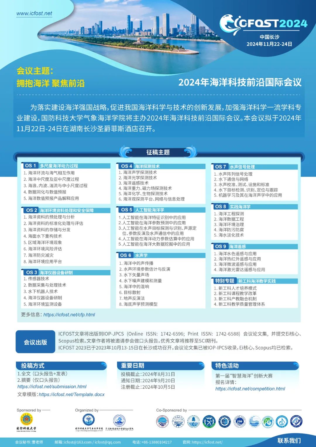 为落实建设海洋强国战略,促进我国海洋科学与技术的创新发展,加强海洋科学一流学科专业建设,国防科技大学气象海洋学院主办的2024年海洋科技前沿国际会议暨第一届“智慧海洋”创新大赛拟于长沙举办。