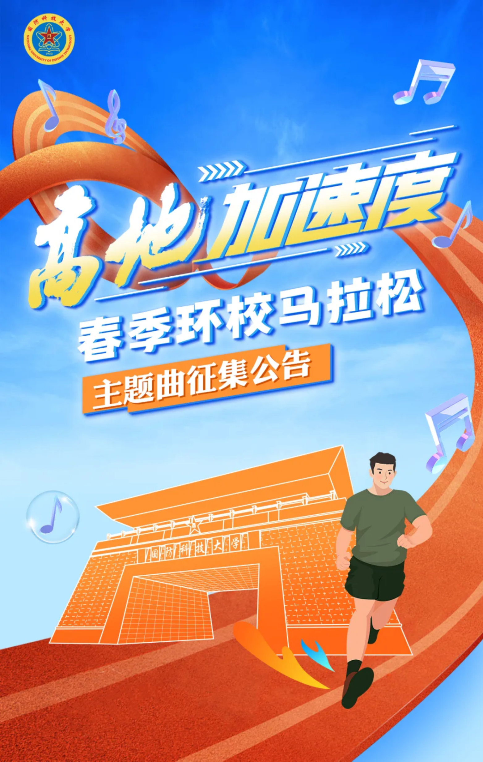 为弘扬体育精神,展现高地风采,3月下旬,国防科技大学将举办“高地加速度”春季环校马拉松,现面向全校师生员工、广大校友及社会人士公开征集活动主题曲,用音乐传递力量,用旋律记录奔跑。