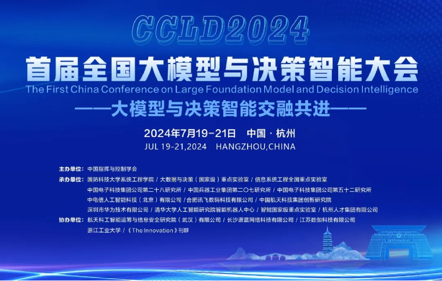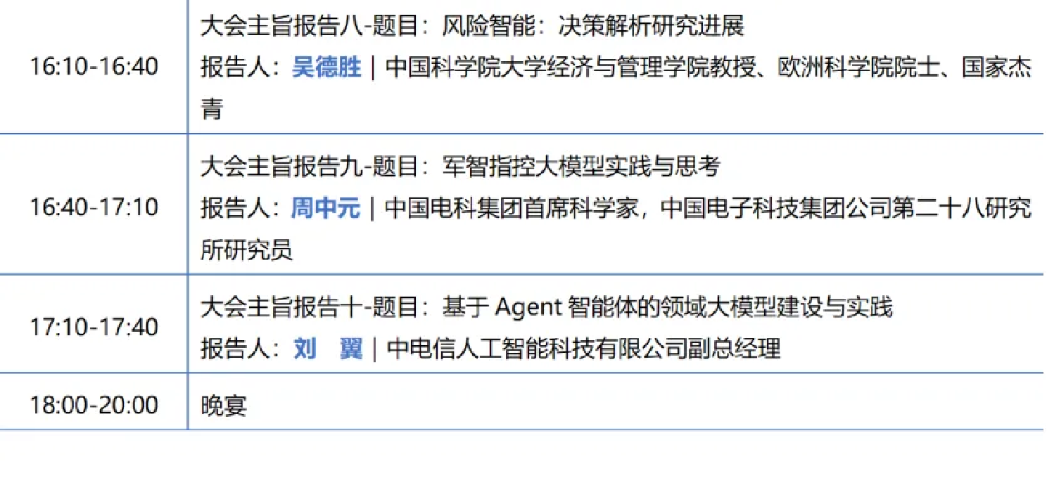 本次大会由中国指挥与控制学会理事长费爱国院士、中国人工智能学会理事长戴琼海院士、国防科技大学王怀民院士担任大会主席。中国指挥与控制学会副理事长刘忠教授、信息系统工程全国重点实验室主任张维明教授和大数据与决策(国家级)重点实验室主任黄宏斌教授担任大会学术主席。大模型与决策智能专委会主任委员黄金才研究员担任大会执行主席。