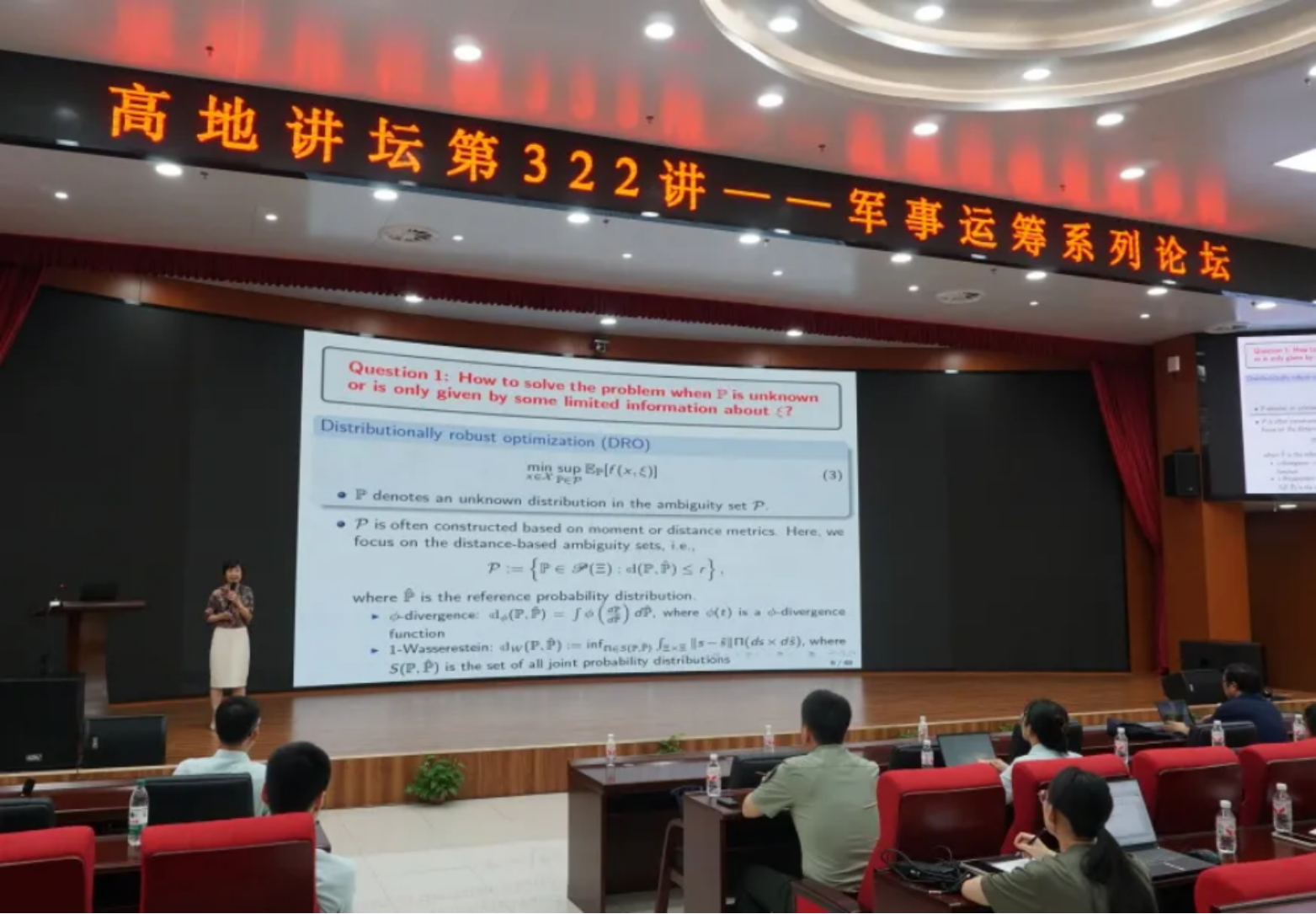 7月16日,高地讲坛第322讲暨系统工程大讲堂第145讲在长沙校区三号院系统工程学院B105报告厅举行。湖南第一师范学院童小娇教授作“具有决策相关模糊集的规避风险的两阶段分布鲁棒混合整数优化”主题报告。本次活动由系统工程学院举办,是军事运筹系列论坛活动之一,80余名学校师生参加。