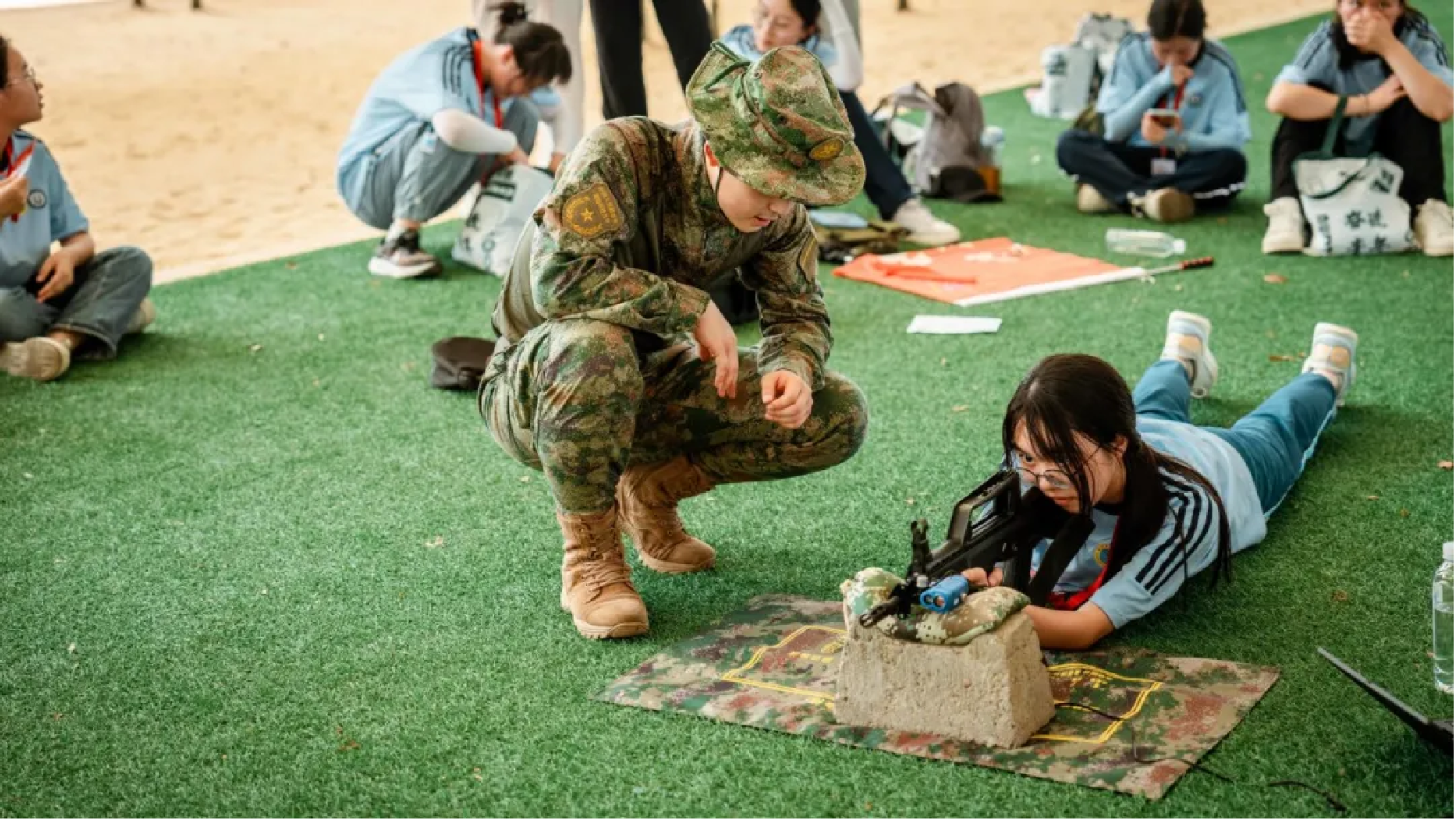 三号院风雨器械棚中,在科大学员的讲解和引导下,营员们不仅学习了95式自动步枪的相关知识,还亲手体验了步枪的分解与结合,并通过模拟射击和真人CS对抗赛,感受到了战士们在实战中的挑战与责任。河南商丘第一高级中学的王梦瑜对此次国防特色实践项目非常感兴趣,“我也想穿上军装,肩负起保家卫国的神圣使命,成为一名无上荣耀的军人。”