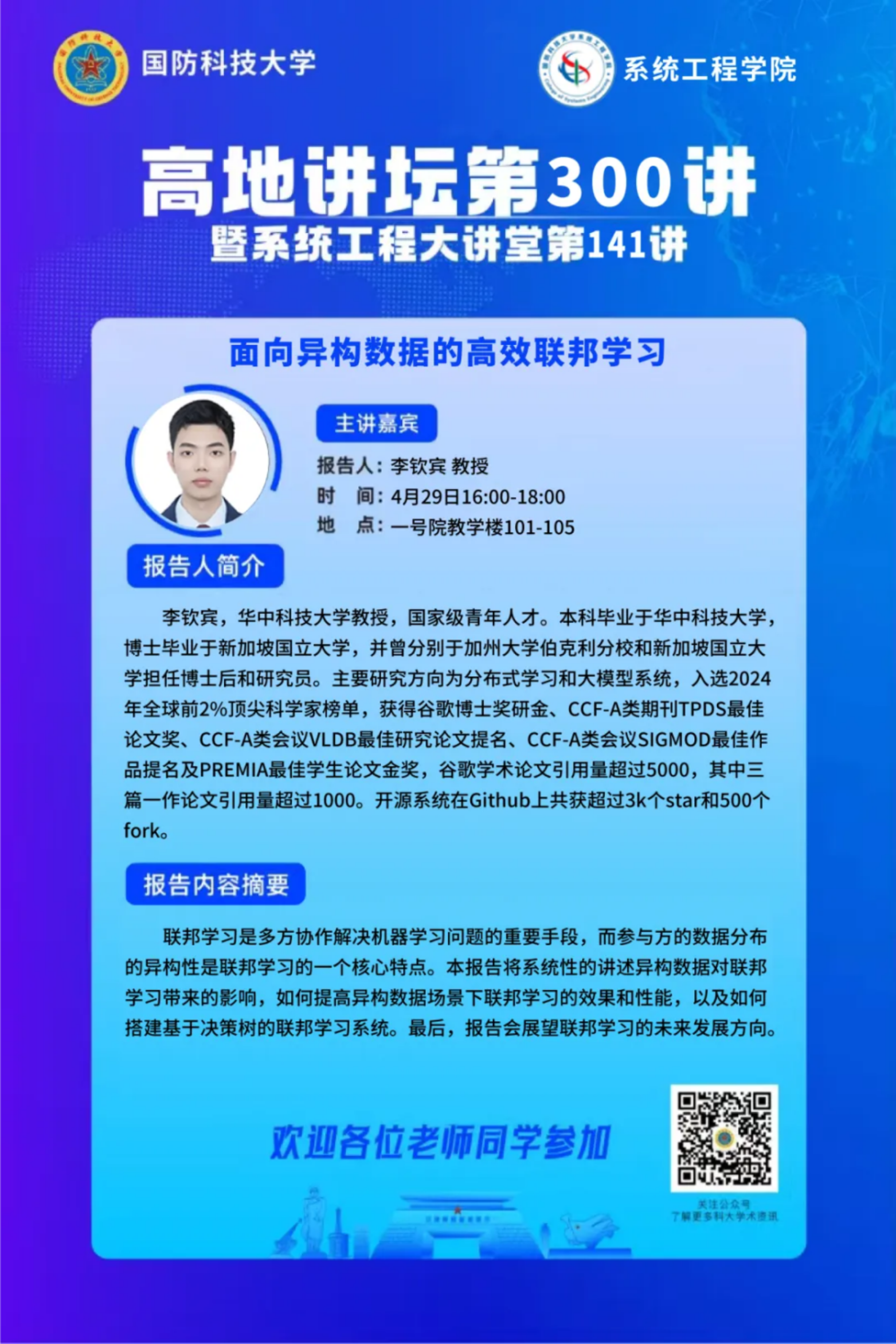 4月21日,高地讲坛第297讲暨系统工程大讲堂第137讲学术活动在学校长沙校区三号院系统工程学院B105报告厅举行。中国科学院徐宗本院士作“大模型数理基础研究:SLeM理论与极限理论”学术报告。活动由系统工程学院举办,200余名学校师生参加。