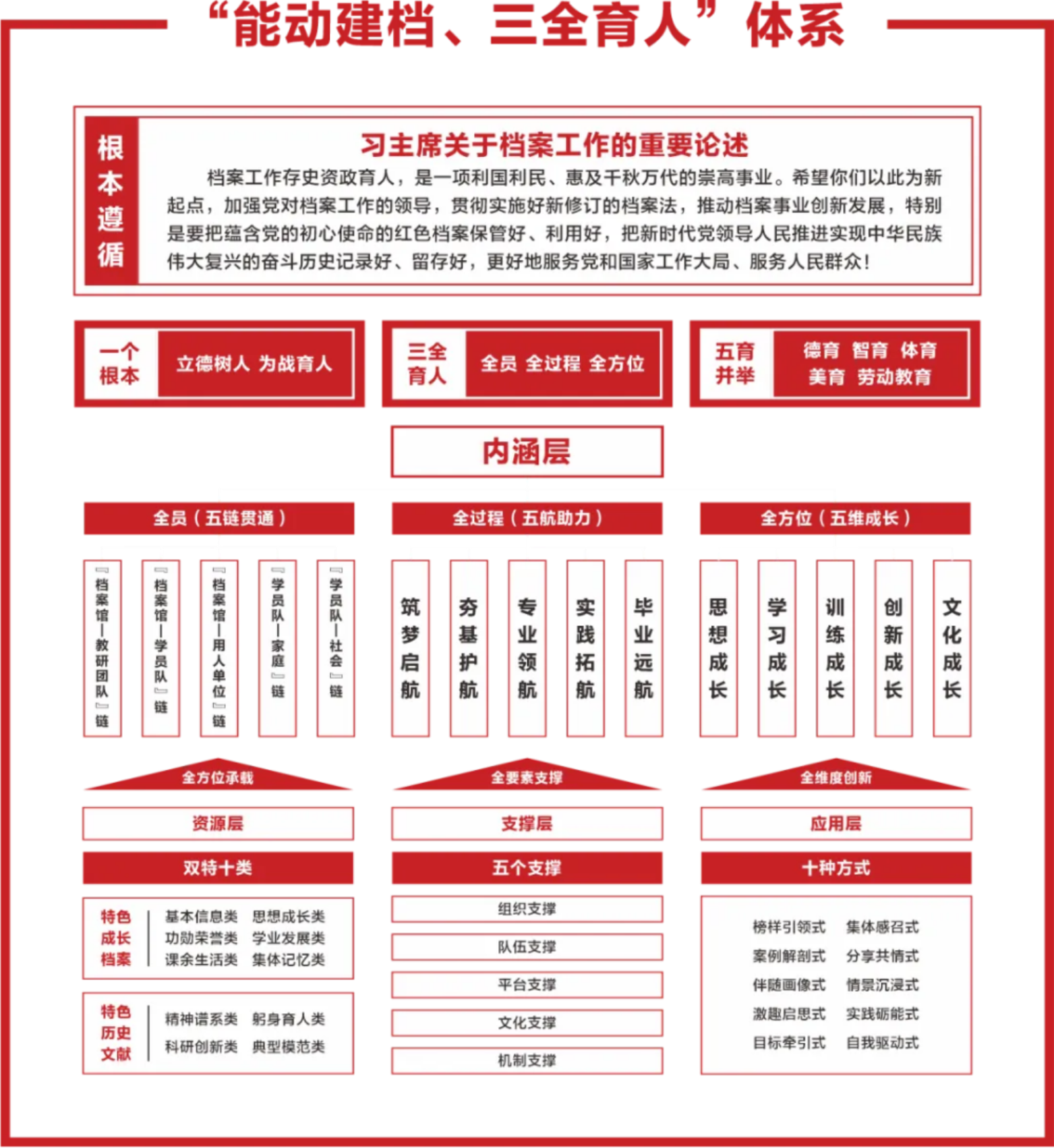 全员:通过“五链贯通”机制,有机衔接档案馆与教研团队、学员队,档案馆与用人单位,学员队与家庭、社会等多方力量,形成协同联动的育人共同体。