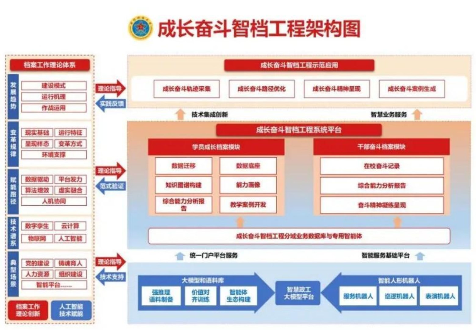 工程始终坚持一流标准,强化顶层设计,系统构建起“能动建档、三全育人”体系图和成长奋斗智档工程架构图,全面融入“智慧政工”建设大局,通过记录学员“五维成长”,助力学员筑牢信仰之魂、夯实知识之基、磨砺技能之体、培育创新之力、涵养人文之美,锻造成为高素质、专业化新型军事人才。