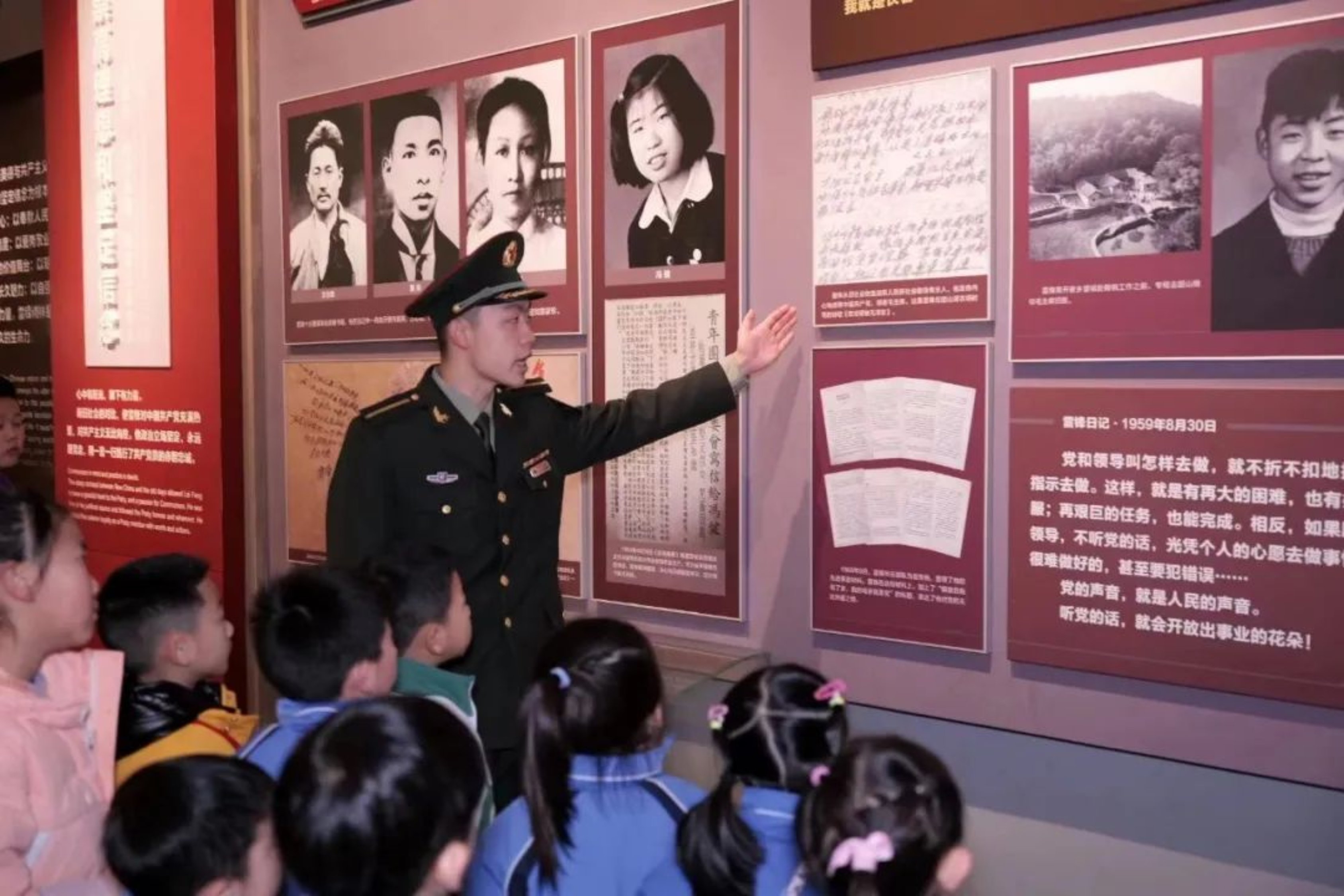 电子对抗学院某学员大队组织学员赴雷锋文化展览馆参观见学,馆内陈列的雷锋铜制半身像、各类书籍、证书、老照片等物件,展现了雷锋短暂而不平凡的一生。在讲解员指引介绍下,参展学员驻足凝视,纷纷表示要向雷锋同志学习,争做新时代雷锋传人。