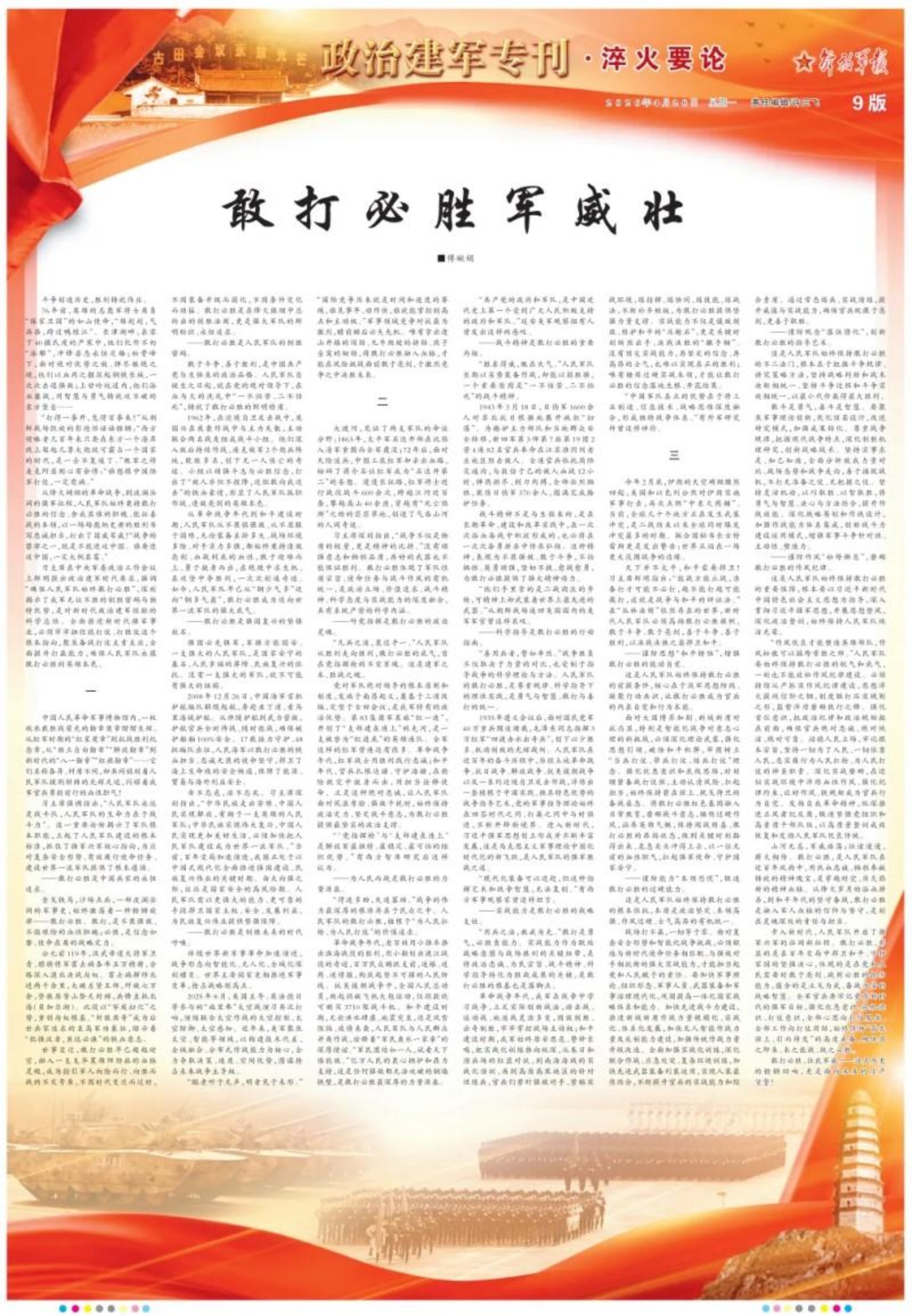 山河无恙,军威浩荡;征途漫漫,薪火相传。敢打必胜,是人民军队在近百年风雨中,用热血忠诚、牺牲奉献铸就的精神瑰宝,是穿越时空、历久弥新的精神血脉。从烽火岁月的浴血拼杀,到和平年代的坚守备战,敢打必胜是融入军人血脉的信仰与坚守,是刻在灵魂深处的责任与担当。