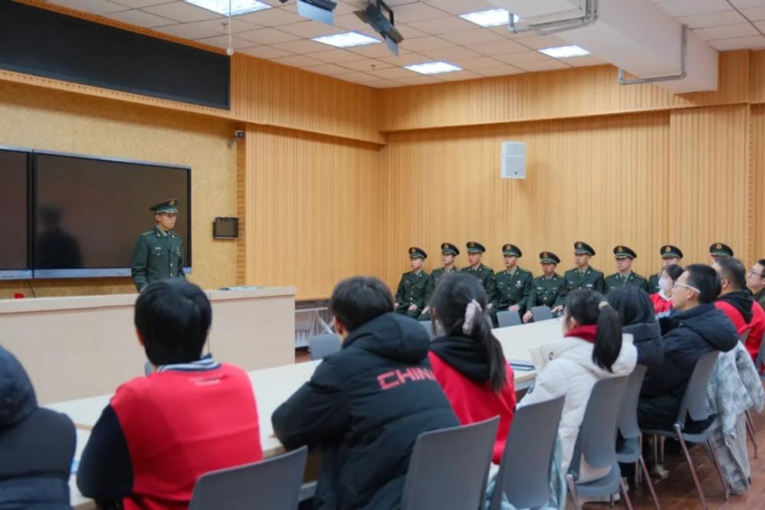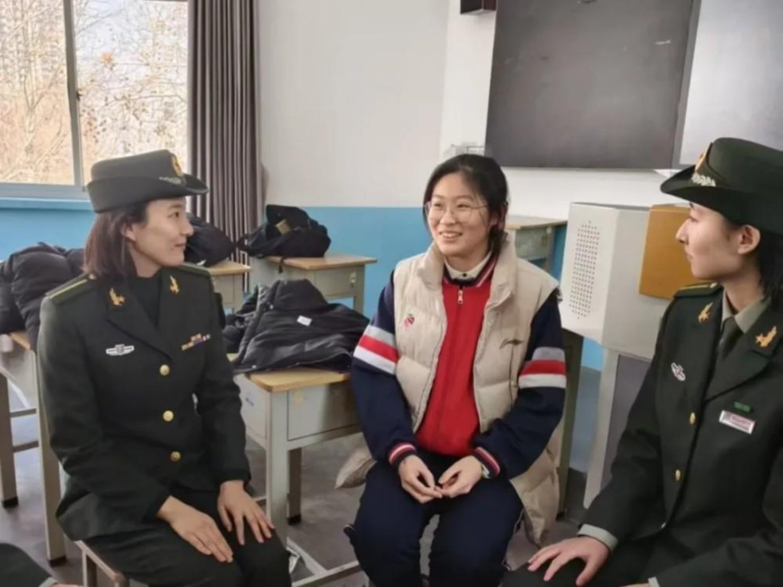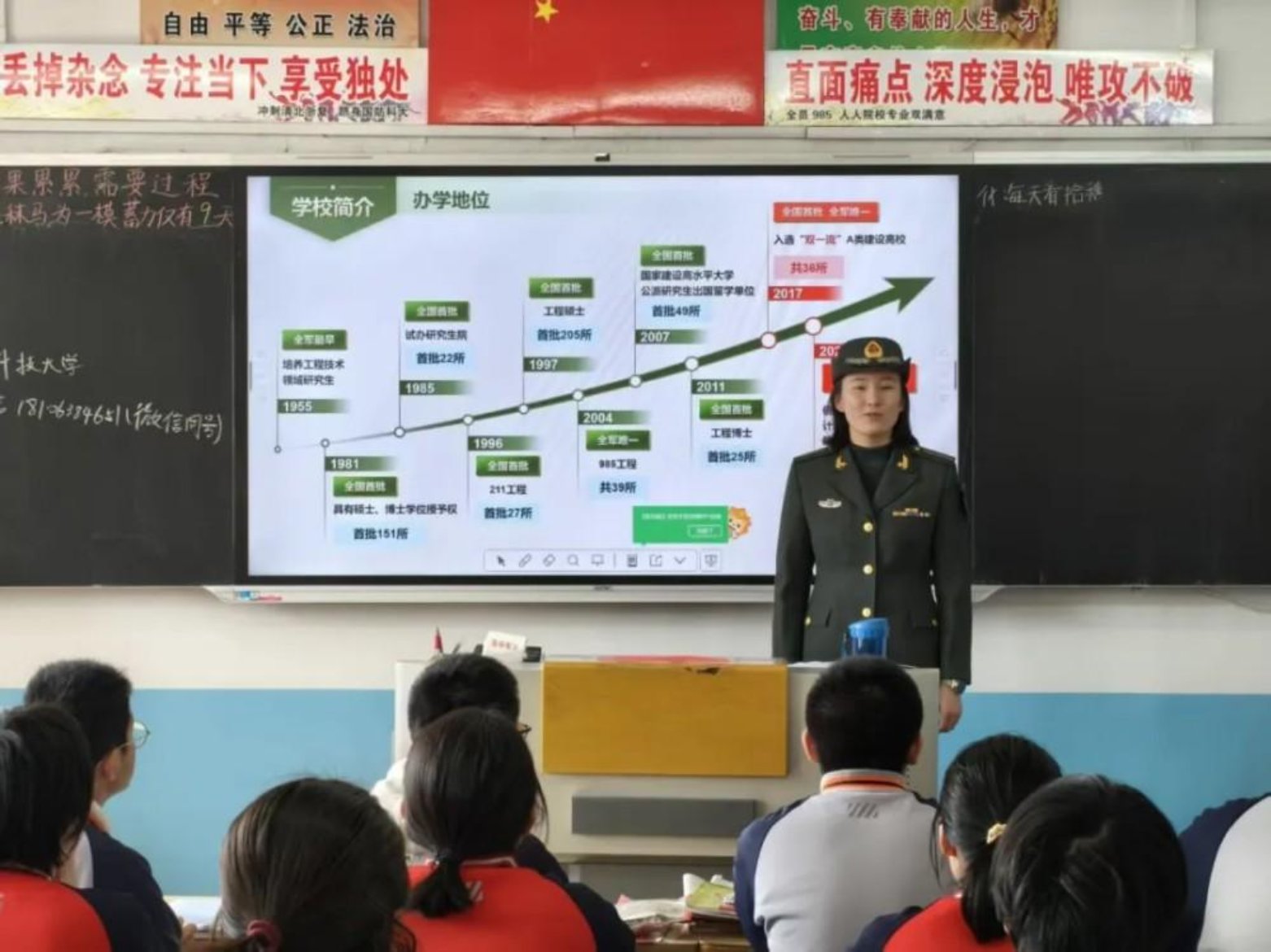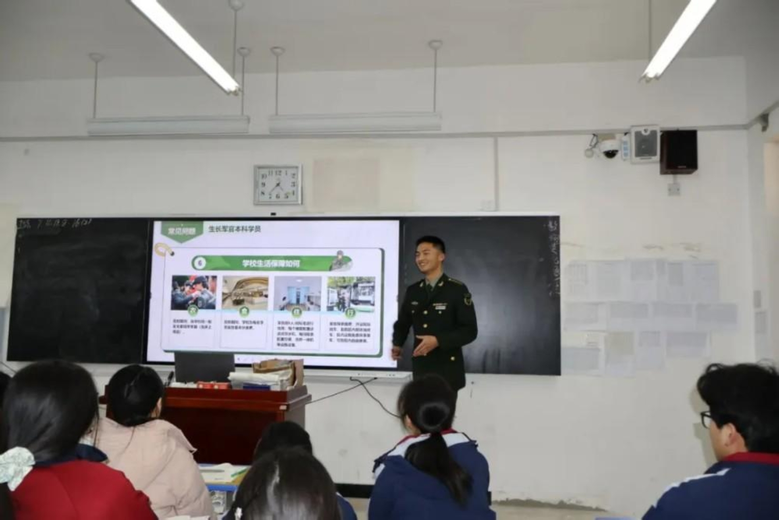 我为同学们讲述军校的日常:训练场上的挥汗如雨、课堂上的严谨认真、集体生活的温暖与团结,并鼓励他们勇敢追求自己的梦想。看到他们认真记录、积极提问的样子,我仿佛看到了曾经的自己,心中涌起一股暖流。