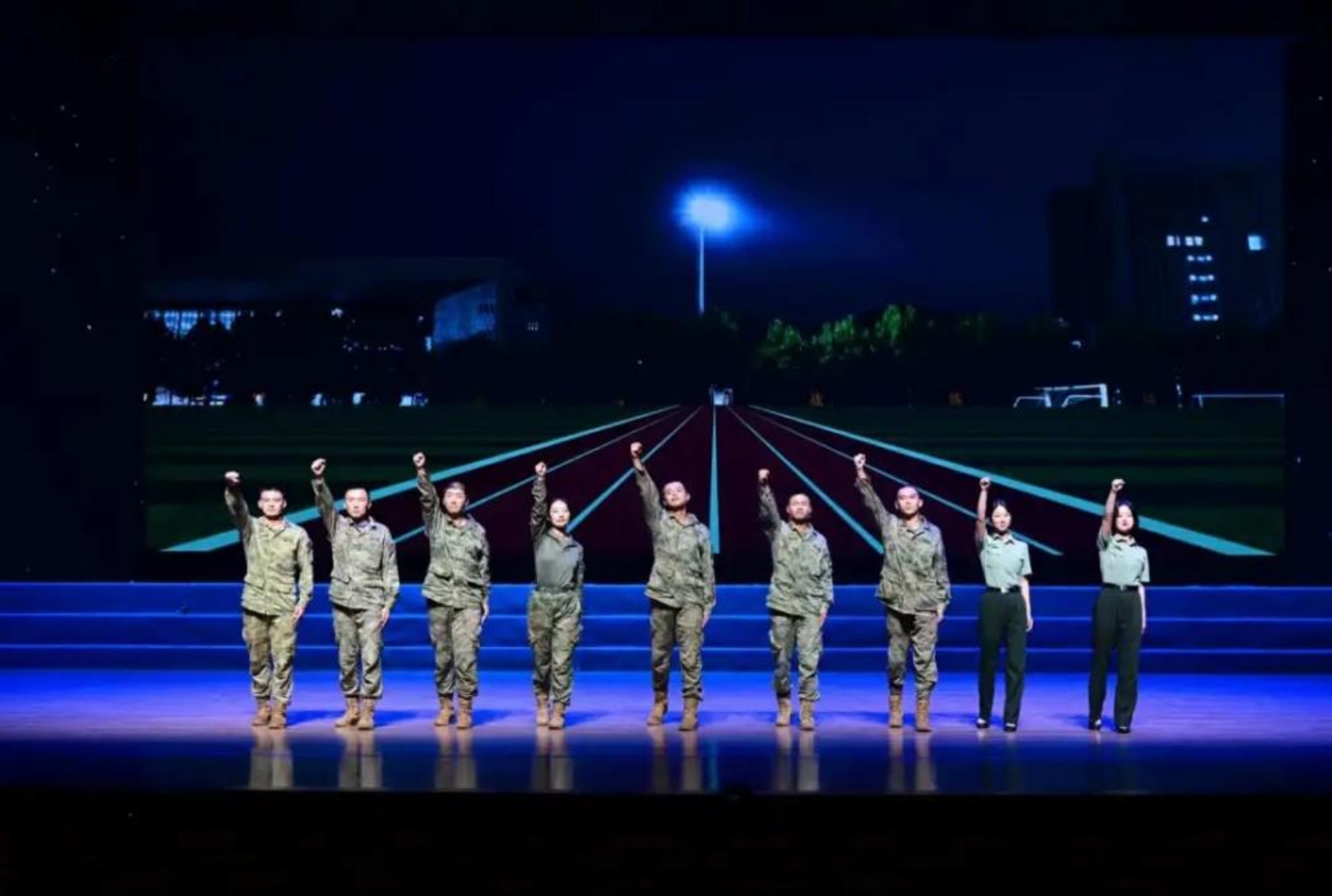 正是舞台的光,照亮了前路。他将这股“最后一百米”的狠劲从剧场带到了平时的学习训练生活中:一次次咬紧牙关跑完的5公里、一日日模拟连骨干岗位上的坚守、一项项和“高峰”学科竞赛小组组员夺得的荣誉,每当放弃的诱惑到来,那束舞台上的光总能驱散他眼中的雾霭,只剩心中的目标。最终,凭借全面的优异表现,孙佳瑞在大一时就荣立三等功,完成了从一名新学员到过硬尖兵的华丽蜕变。