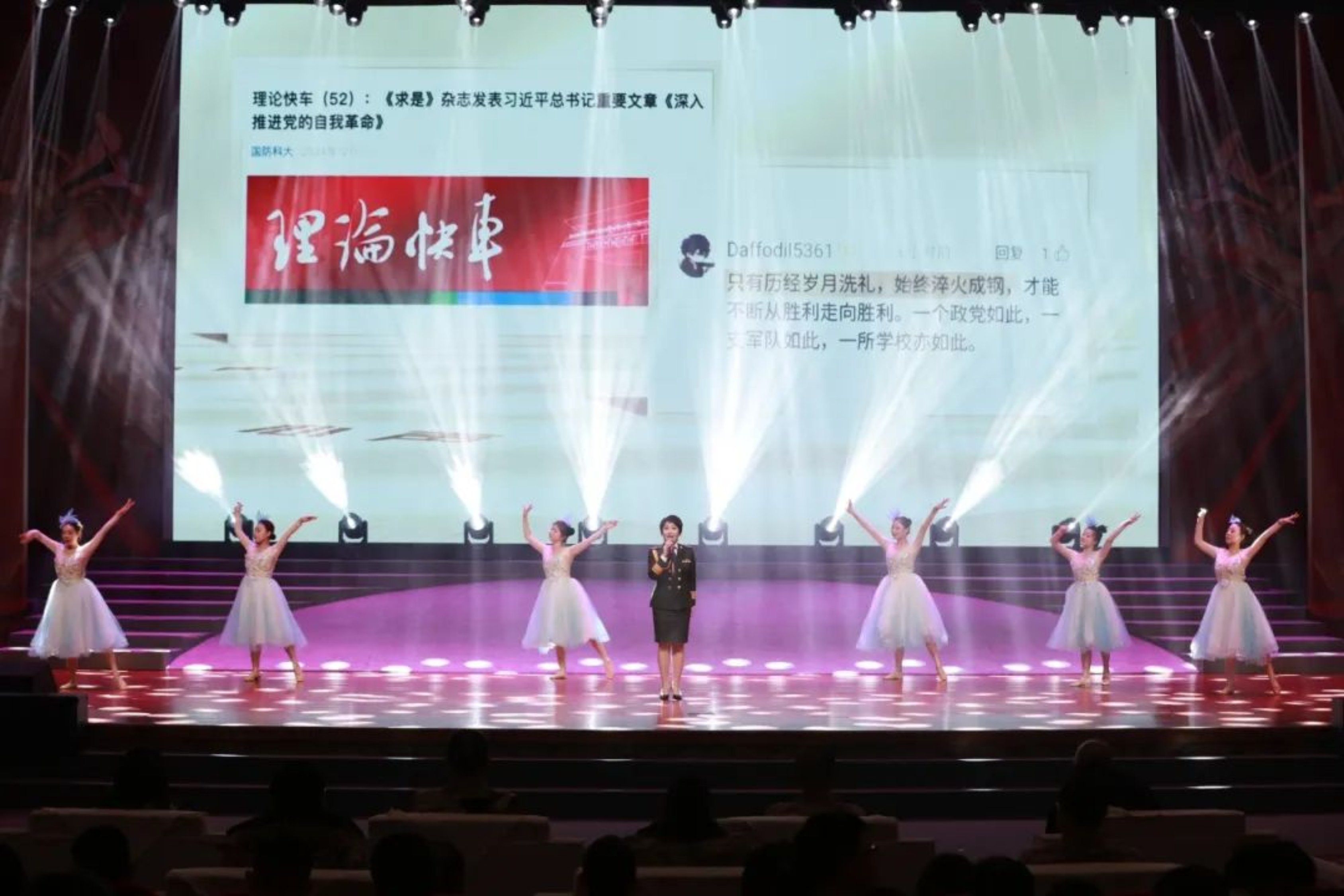 独唱《梨花颂》表达了对千古爱情故事的追忆和感叹。由学校“高地”音乐创作室带来的科大原创歌曲联唱《中国之道》《奔跑》《青春戎华》,表演者用奋进的姿态诠释着科大人强军兴校的永恒信念。