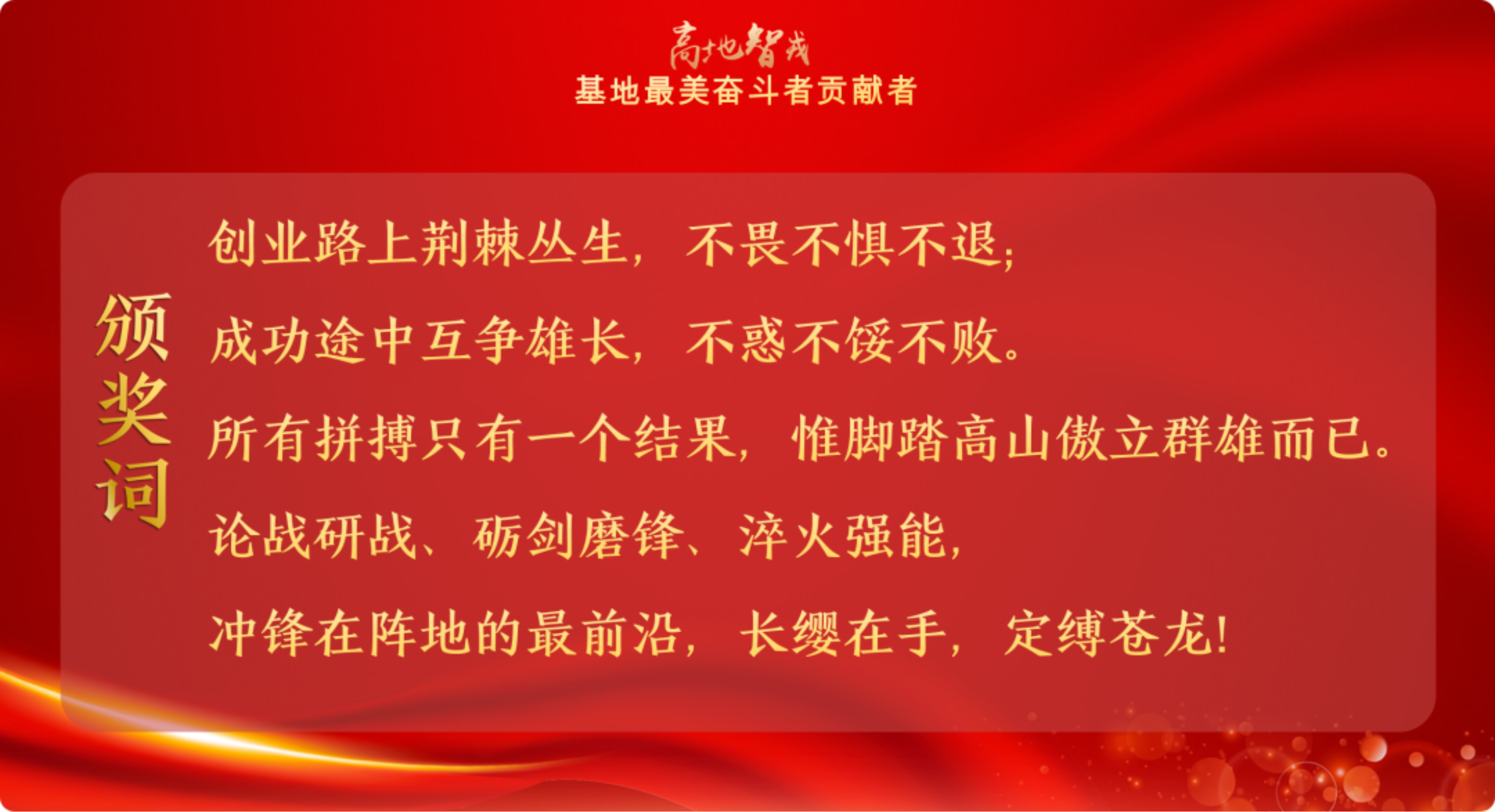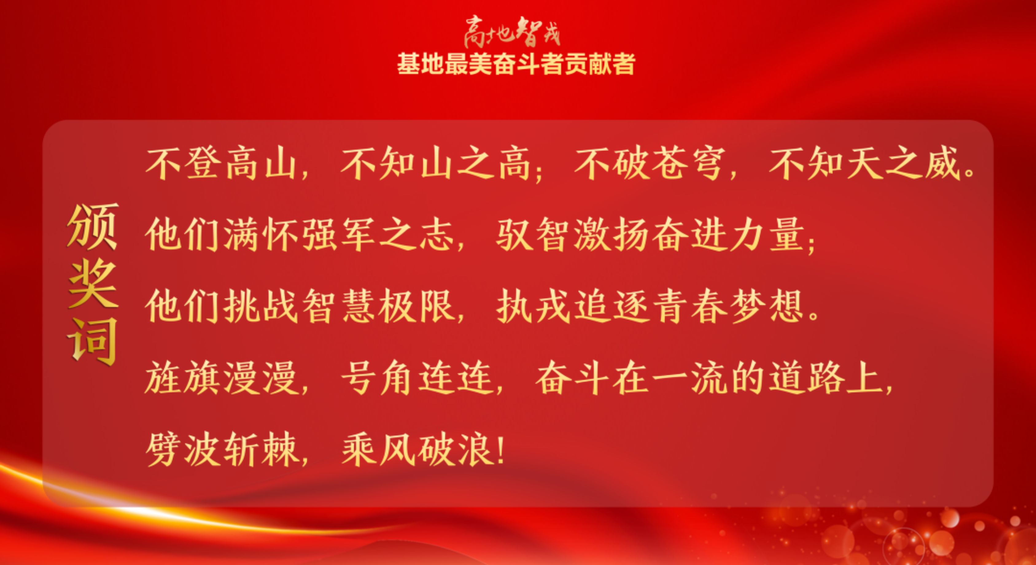 驭智砺兵执戎铸将勇攀一流高峰近日,国防科技大学试验训练基地举行“高地·智戎—基地最美奋斗者贡献者”颁奖典礼,“奋进一流”“创业先锋”“坚实后盾”“特别贡献”“特别纪念”五类典型代表走上颁奖舞台、讲述强军故事、展现军人担当。下面,带您走进这场精彩纷呈、催人奋进的颁奖典礼现场。