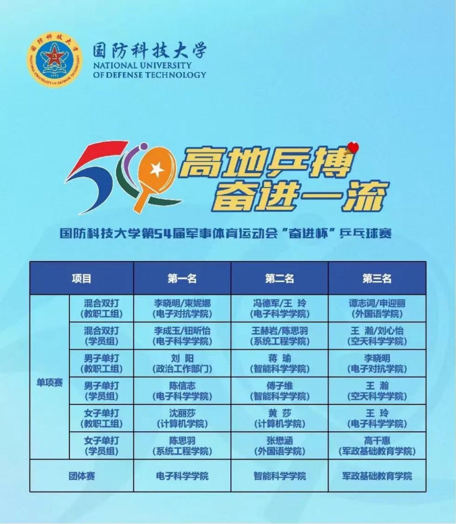 9月21日,国防科技大学第54届军事体育运动会“奋进杯”乒乓球赛在长沙校区一号院高地文体馆圆满收官。