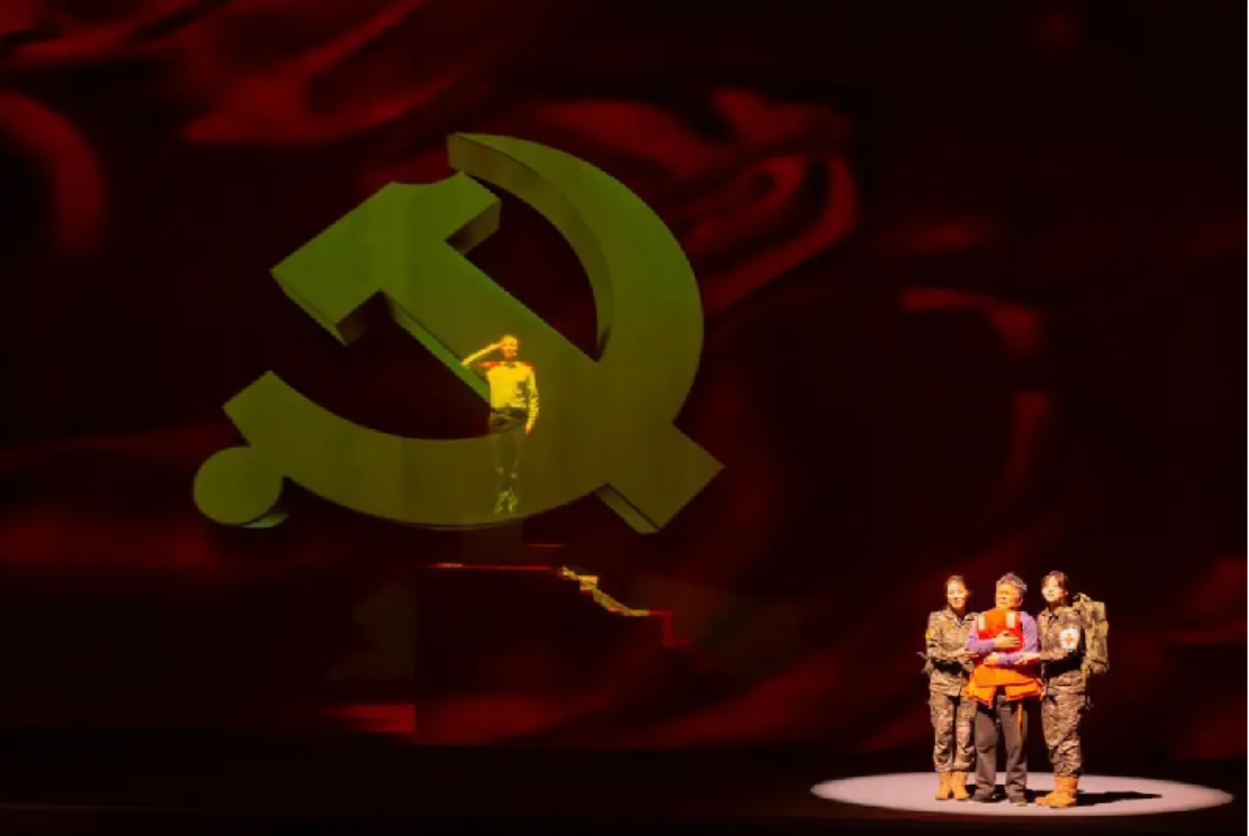 舞台上,孙明礼在战友的追忆里高举右手向党旗宣誓,此时,原型人物剪影也在大屏幕上浮现。这一幕,让不少学员落下泪来。