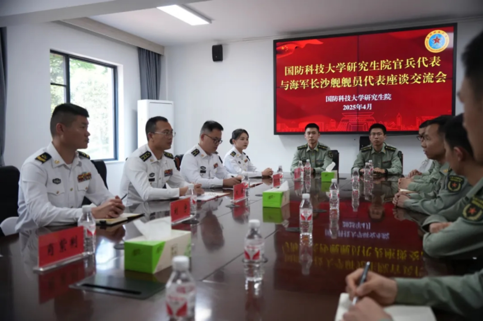 随后,长沙舰官兵走进国防科技大学,与我校研究生学员开展了一场跨越战位与讲台的青春对话,以实战经验与科技智慧共探强军路径。座谈交流中,不同的青春轨迹在此交汇碰撞,新时代青年官兵用各自的方式,为铸牢祖国的钢铁长城贡献青春力量。