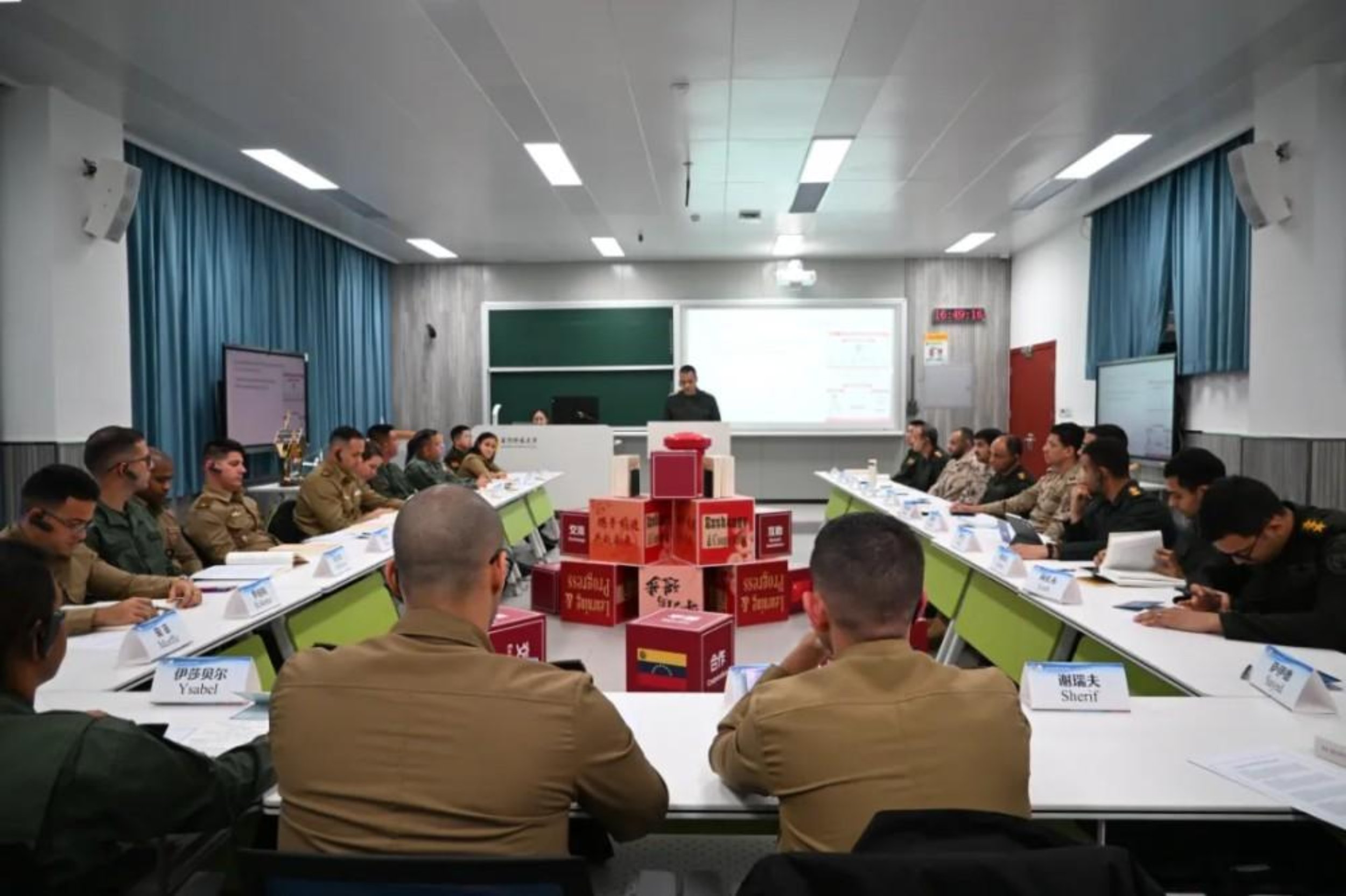 活动伊始,中外军官共同学习了《求是》杂志刊发的习近平总书记重要文章《推动全民阅读,建设书香社会》。通过领读解读,大家进一步领悟了阅读在获取知识、启智增慧、涵养品格等方面的重要作用,外军学员对于此次好文好书的推荐表示赞许。