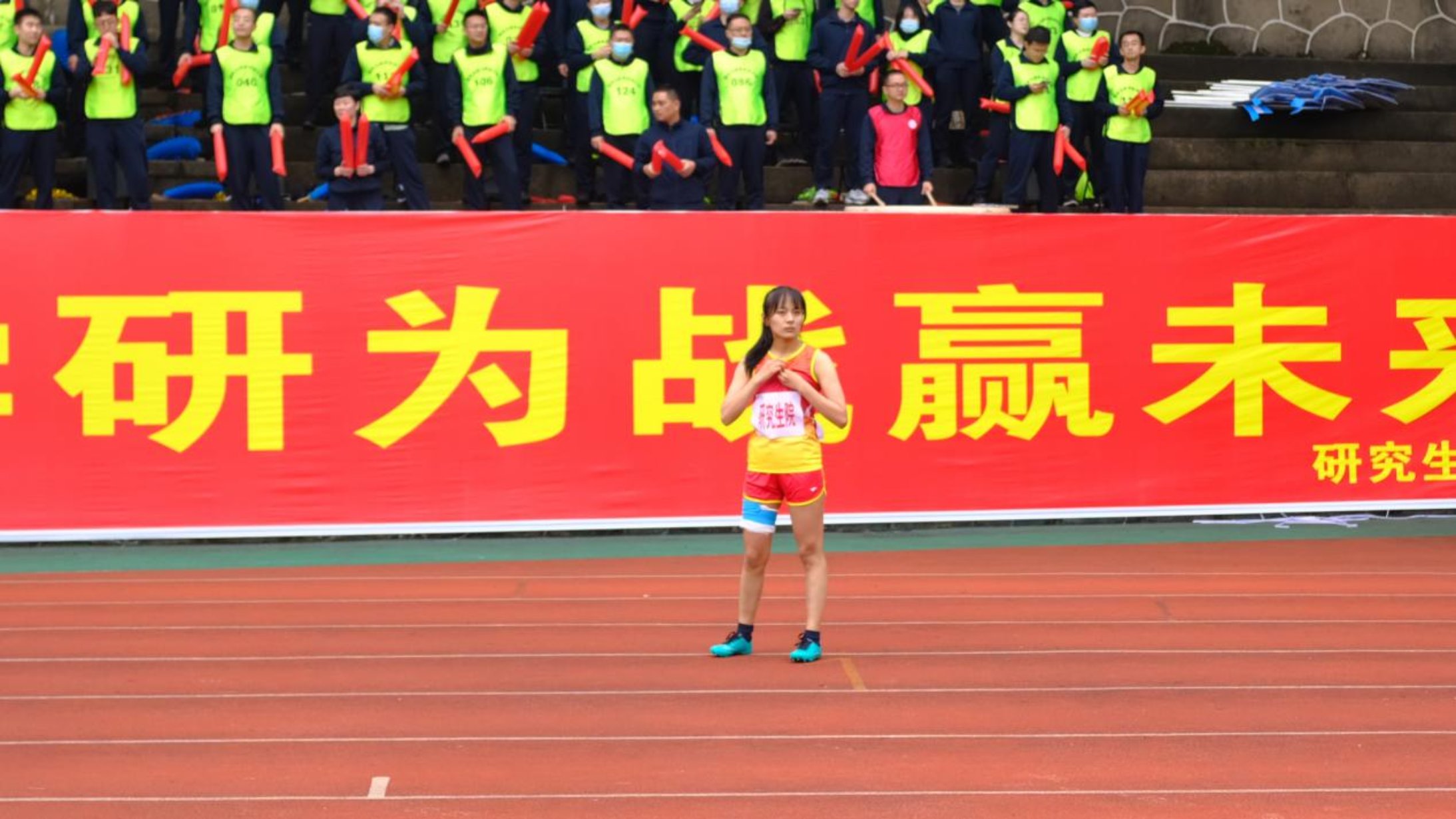 “在身披研究生院的赛服站在赛场上的时候,身体的不适感忽然都消失了,我感觉自己身体的能量在迸发。”王媛赛后这样说道。在她眼中,不为掌声的注释,只为辛勤的汗水化为前进的步伐;不为鲜花的围绕,只为坚定的信念化为不停的奔跑;不为刹那的荣耀,只为心中的梦想化为成功的脚步。她让我们明白:满头的大汗、湿透的衣衫、执着的信念,才是她收获到的最宝贵的勋章,她是自己的百米接力女王。