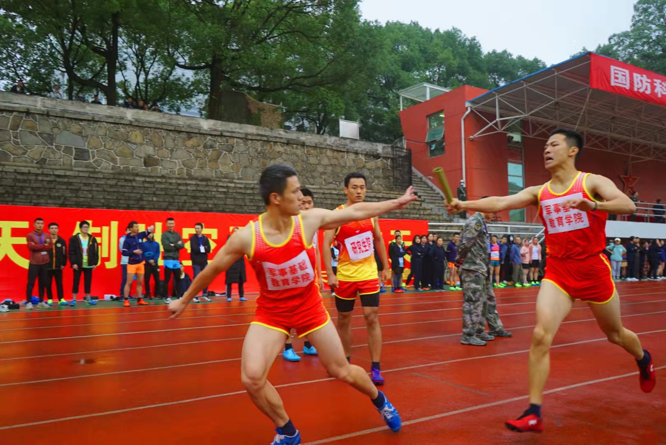 下午17时,男子学员A组4X400米接力军事基础教育学院代表队获第一名。从去年的第一名,到今年的卫冕冠军,金牌闪耀的背后,是日日夜夜的付出。阴雨连绵,难掩激情,4×400米的运动员在场上蓄势待发。只听一声枪响,第一棒的肖国铮便如离弦的箭一般冲出起跑线。400米短短的一圈,拼的是速度和耐力,暂时领先并不意味着胜利,四人默契的配合,接力棒的精准传递,才是确保赢得比赛的制胜关键。