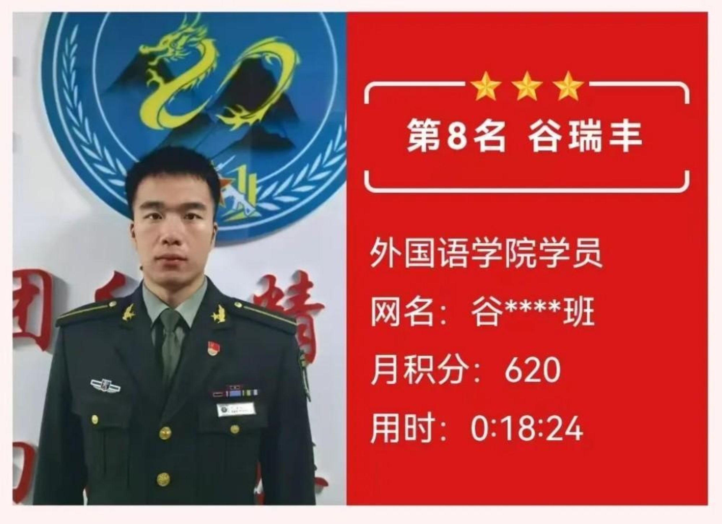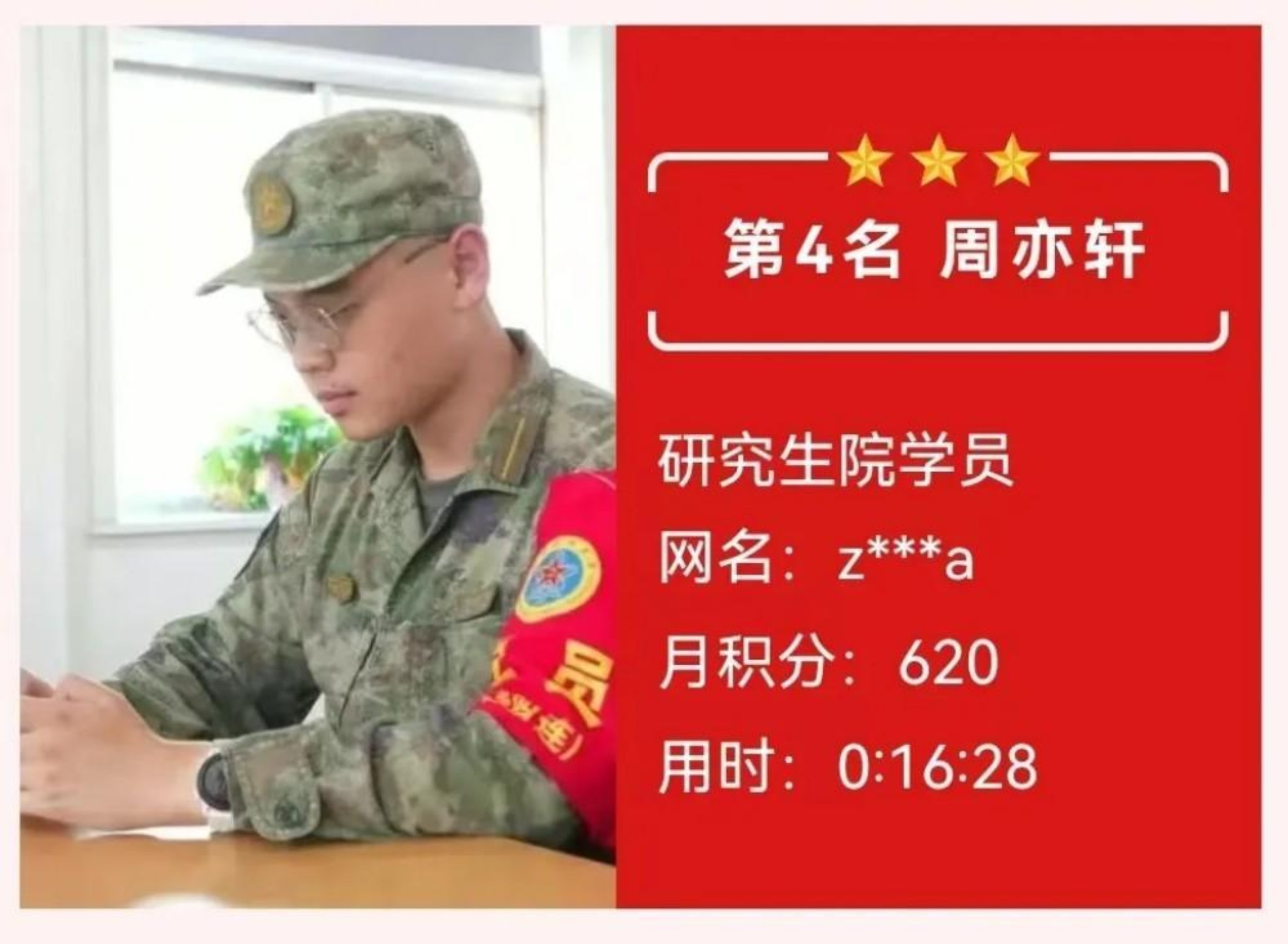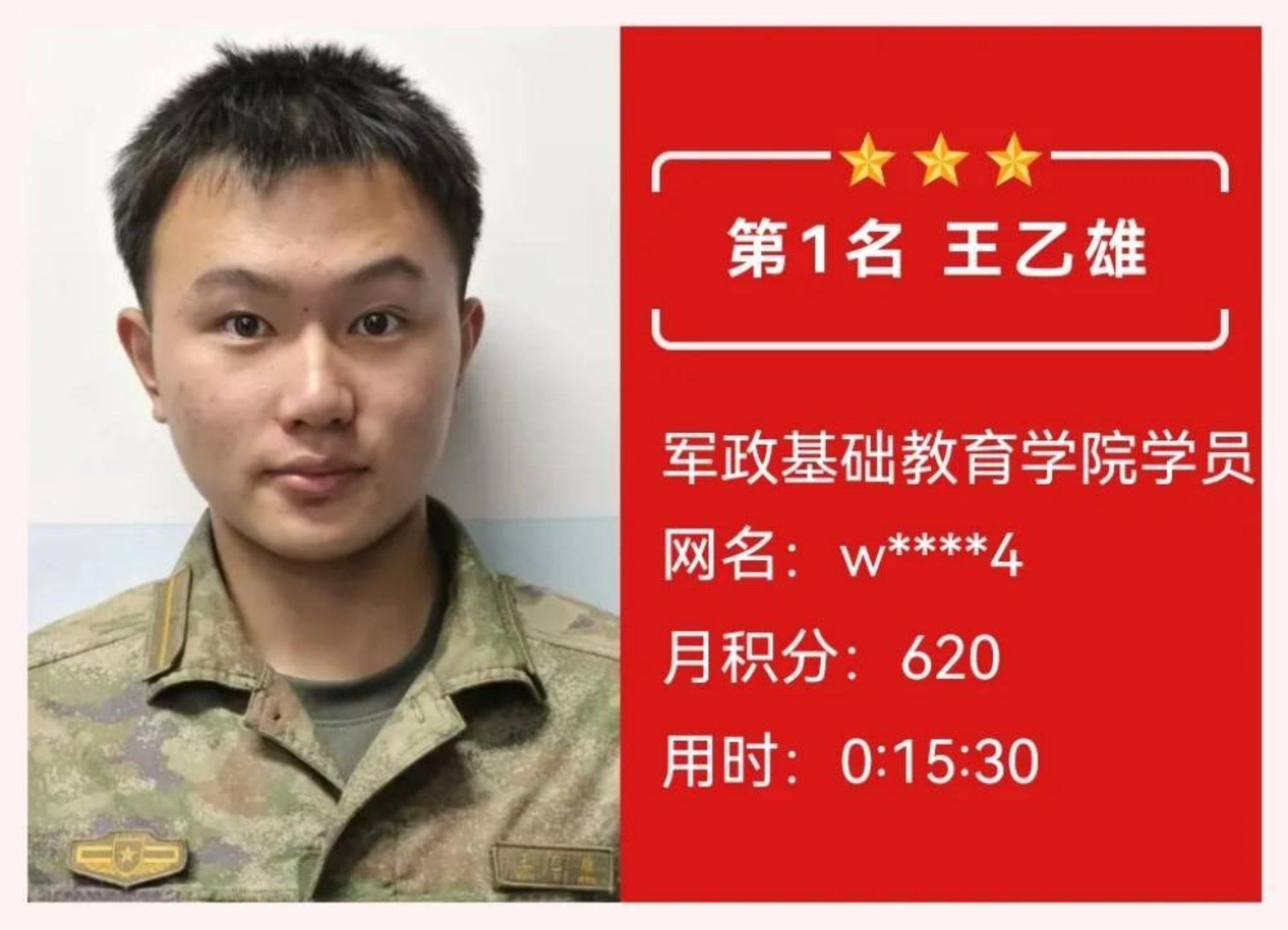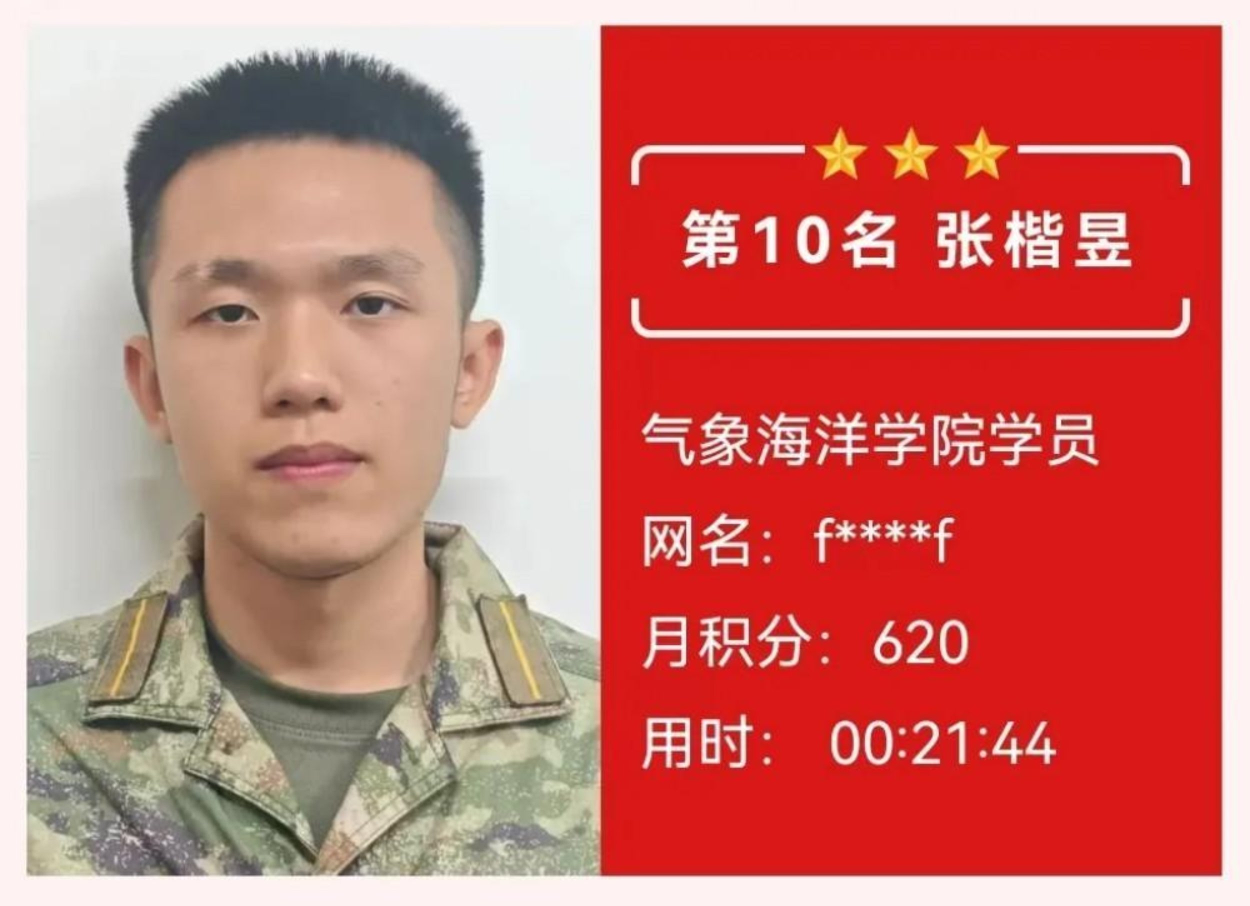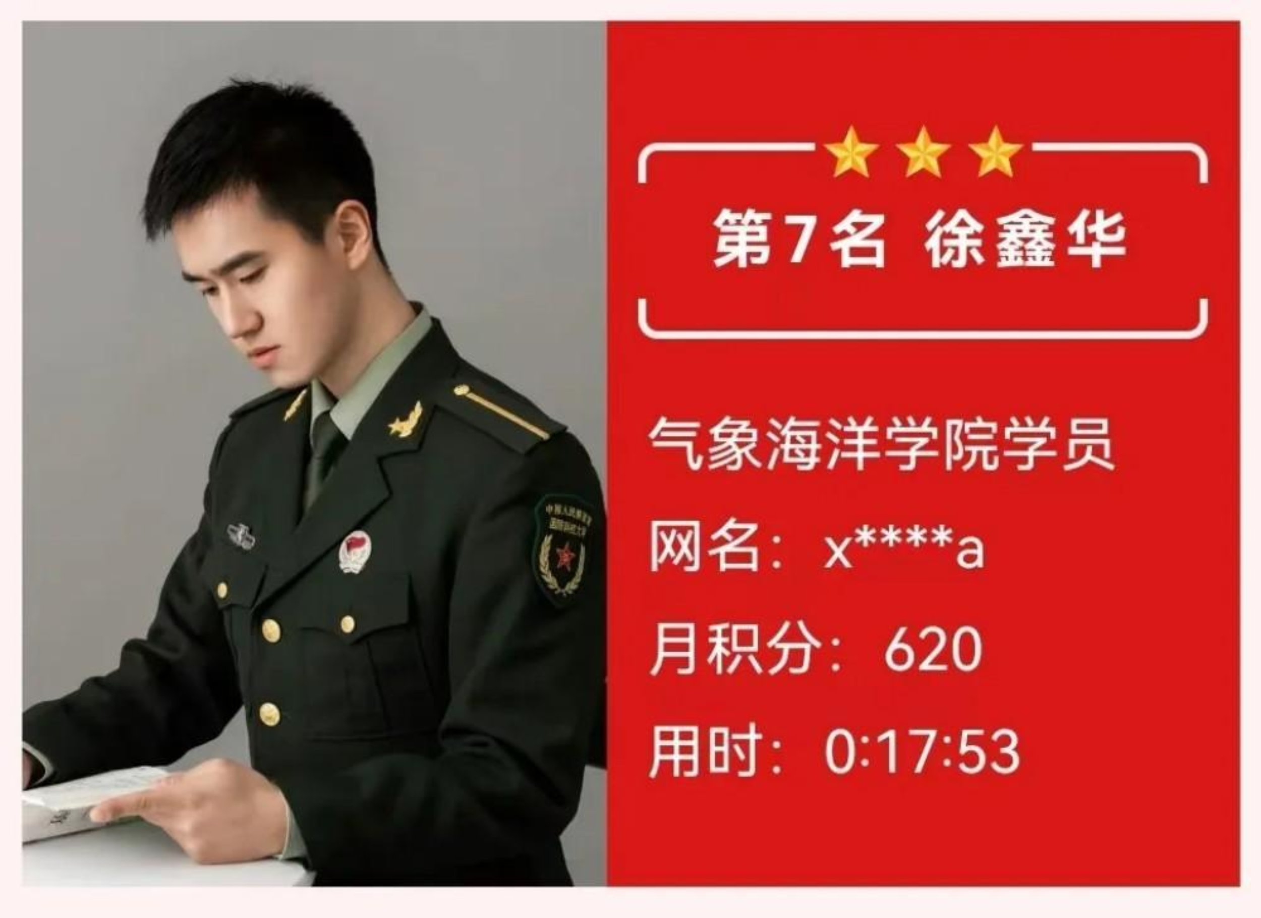 获奖感言:学道须当猛烈,始终确守初心。在理论答题的层层闯关中,我深切体会到知识如何沉淀为内心的力量。每月的积累不仅是智慧的叠加,更是意志的锤炼。那些与知识相伴的深夜,那些反复推敲的瞬间,都在默默锻造着军校学员应有的沉稳与坚韧,这份荣誉属于每个共同奋斗的日夜。未来我将继续厚积薄发,让理论之光照亮前行之路,在强军征程中锤炼使命担当。