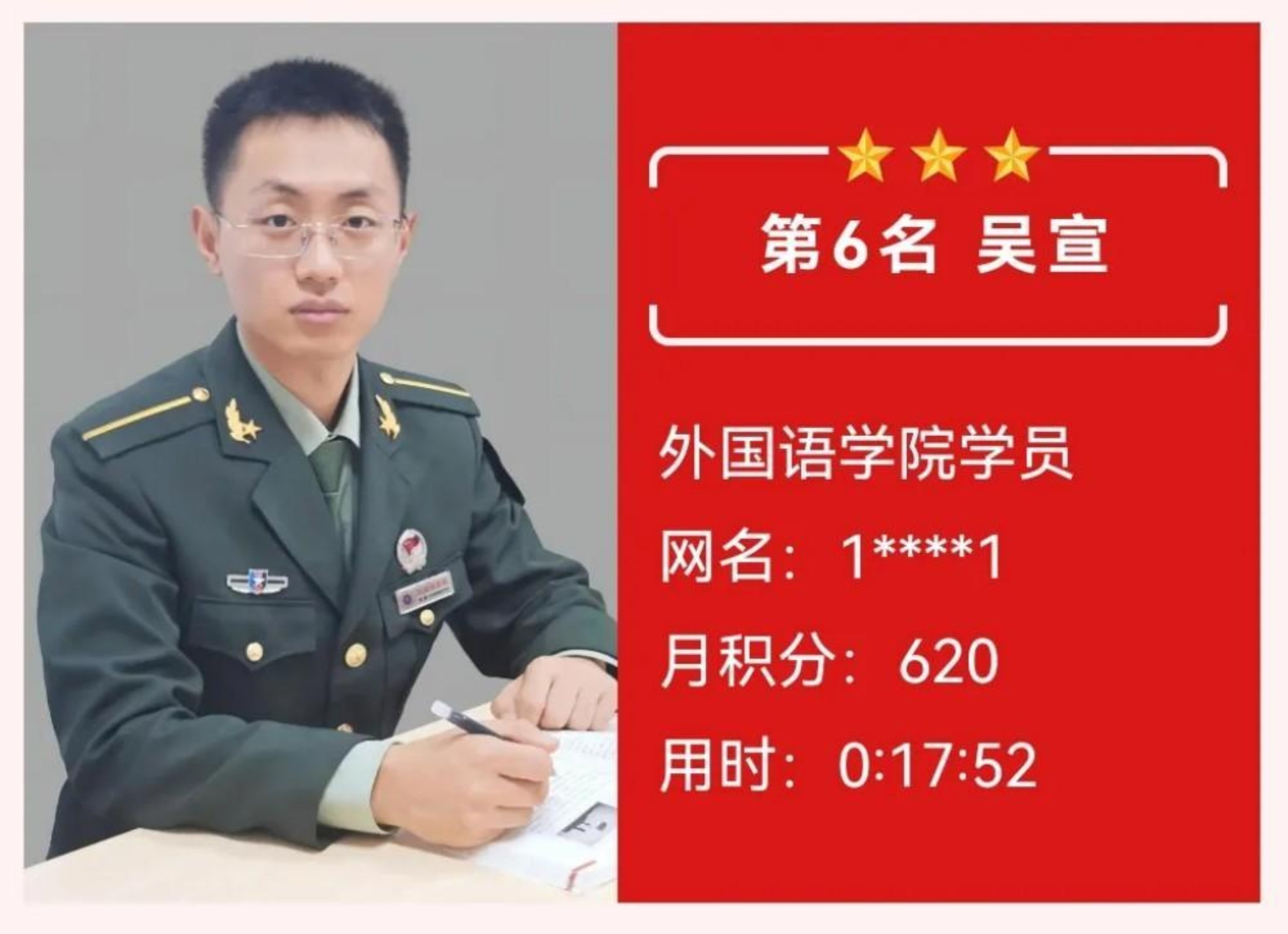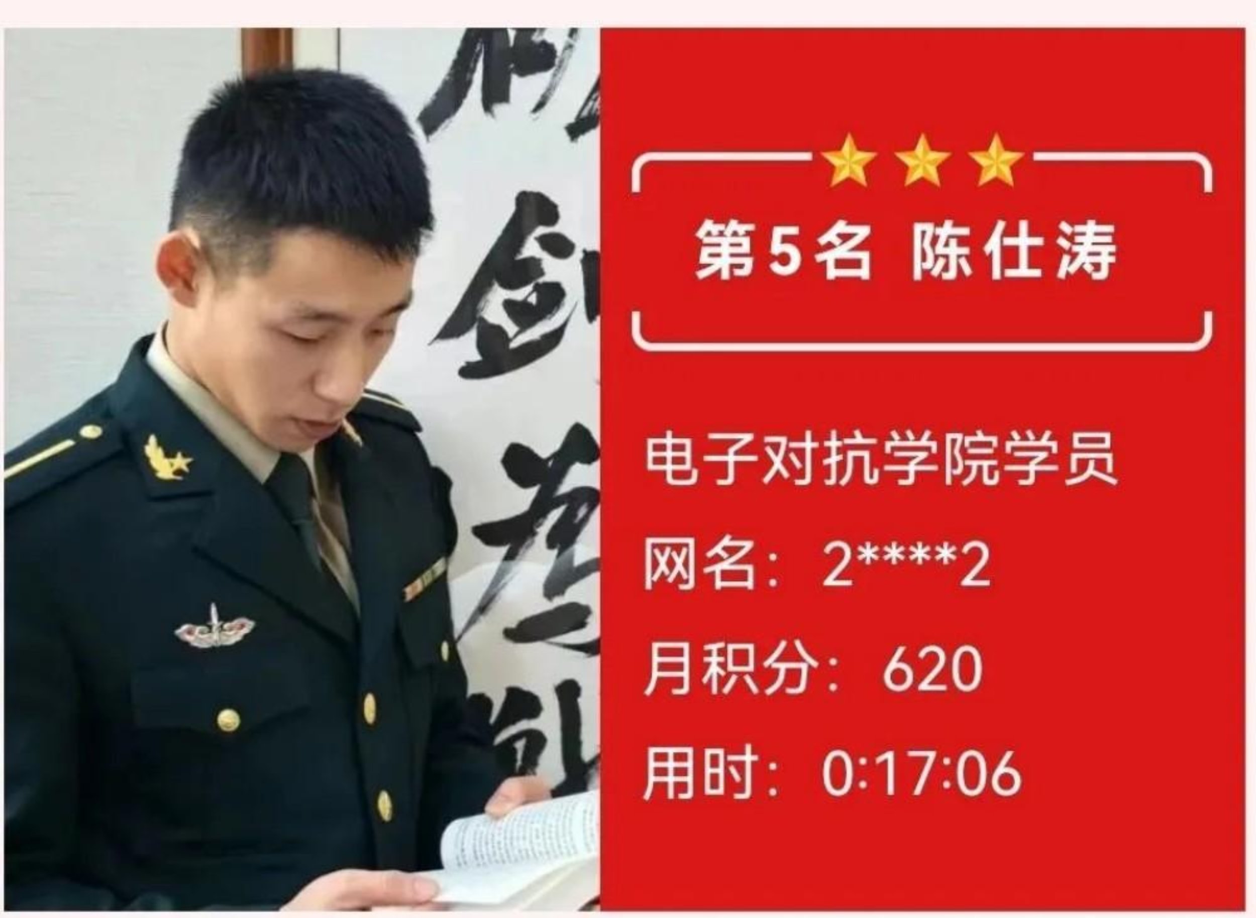 获奖感言:军人以勇争红旗为荣。理论融于实践是我们前进的目标,我将以荣誉为新的起点,继续以“学为战、练为战”的标准,把理论淬炼成锋刃,把闯关精神转化为胜战本领,用实际行动践行“理论闯关挑战者,必是战场打赢人”的铿锵誓言。