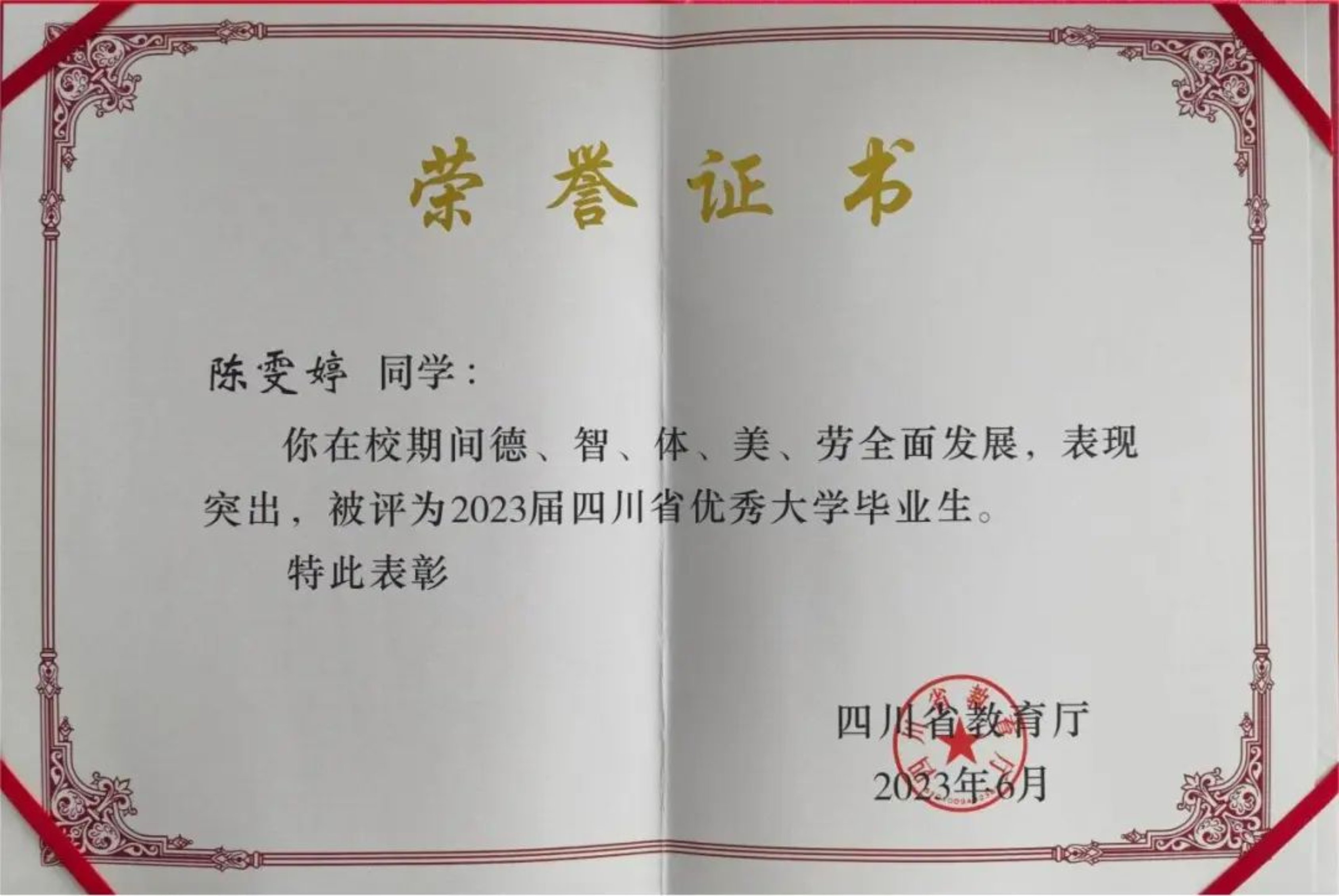 陈雯婷四川省优秀毕业生证书
