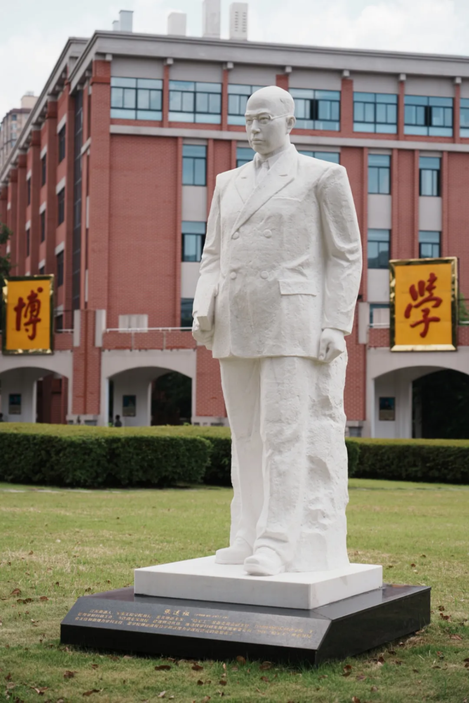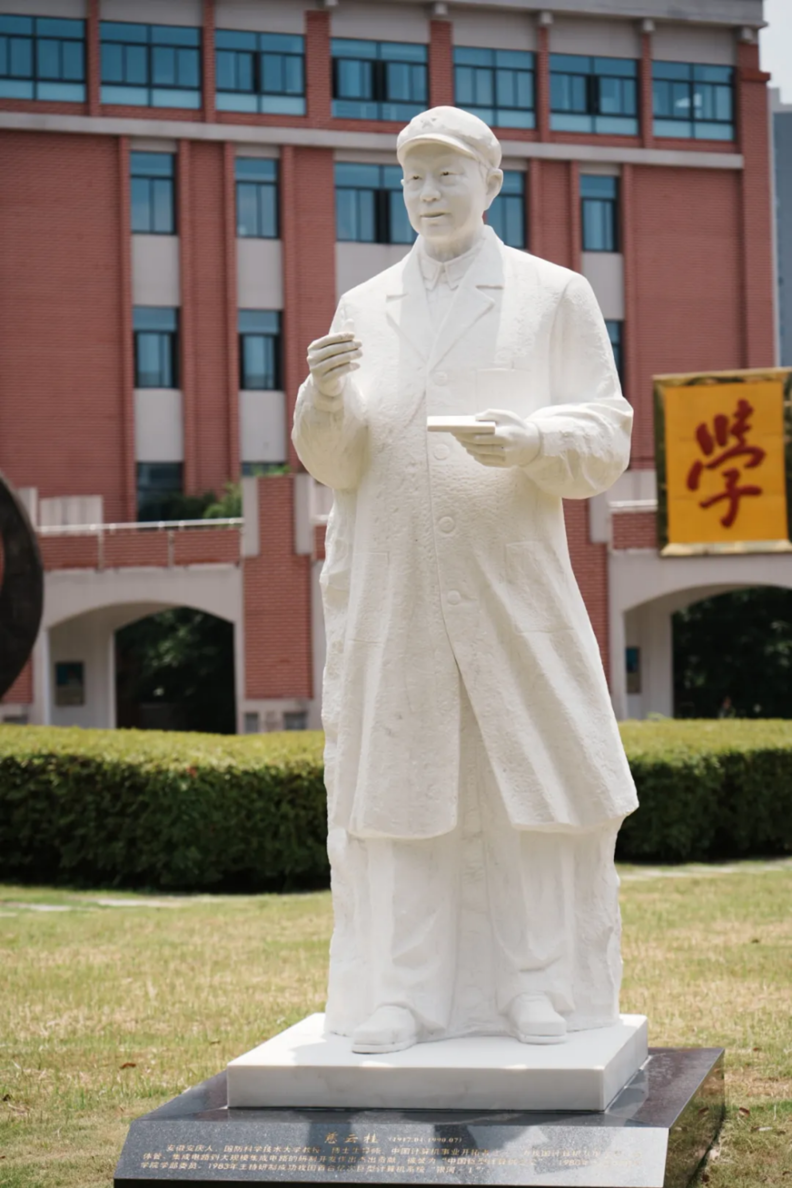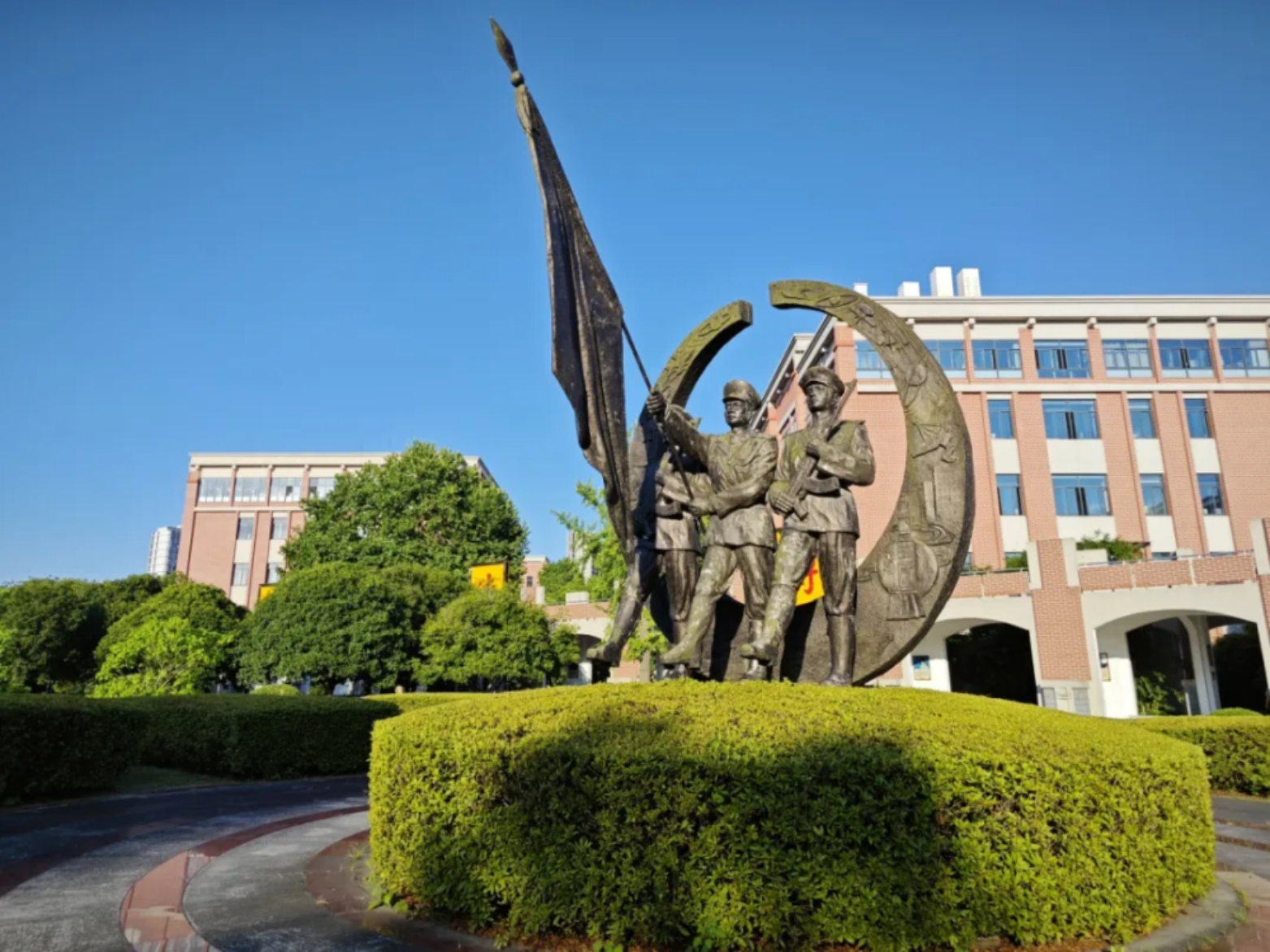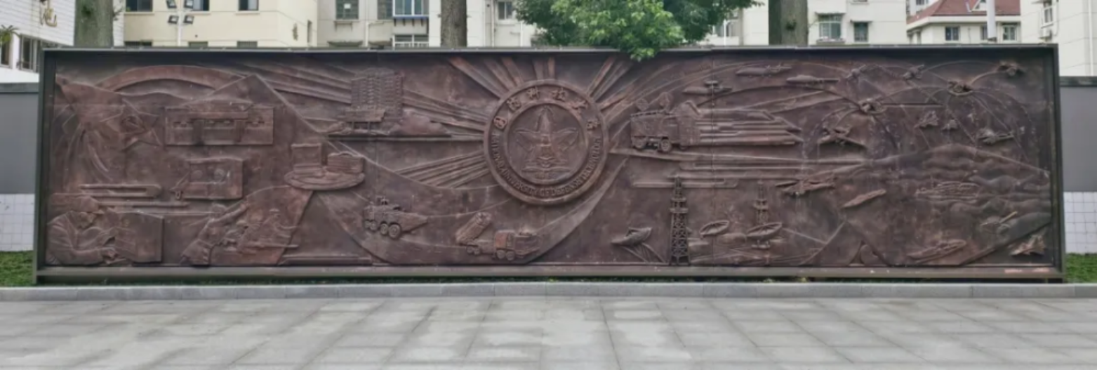 校史墙的铭文,队列旁的群雕