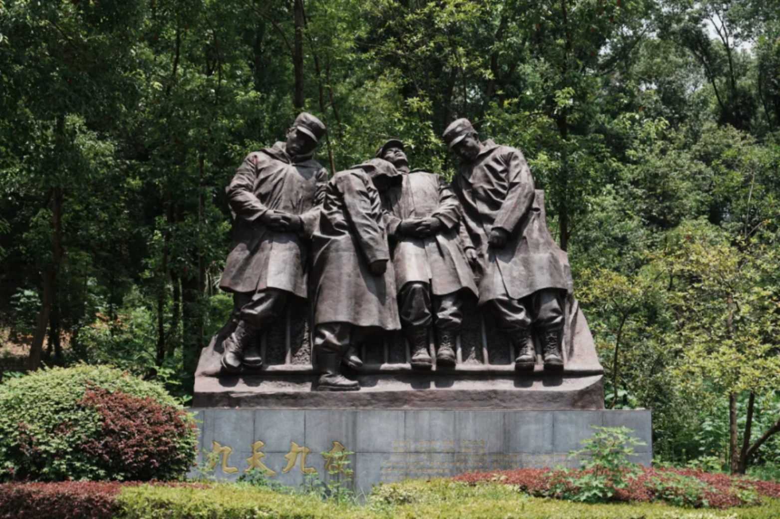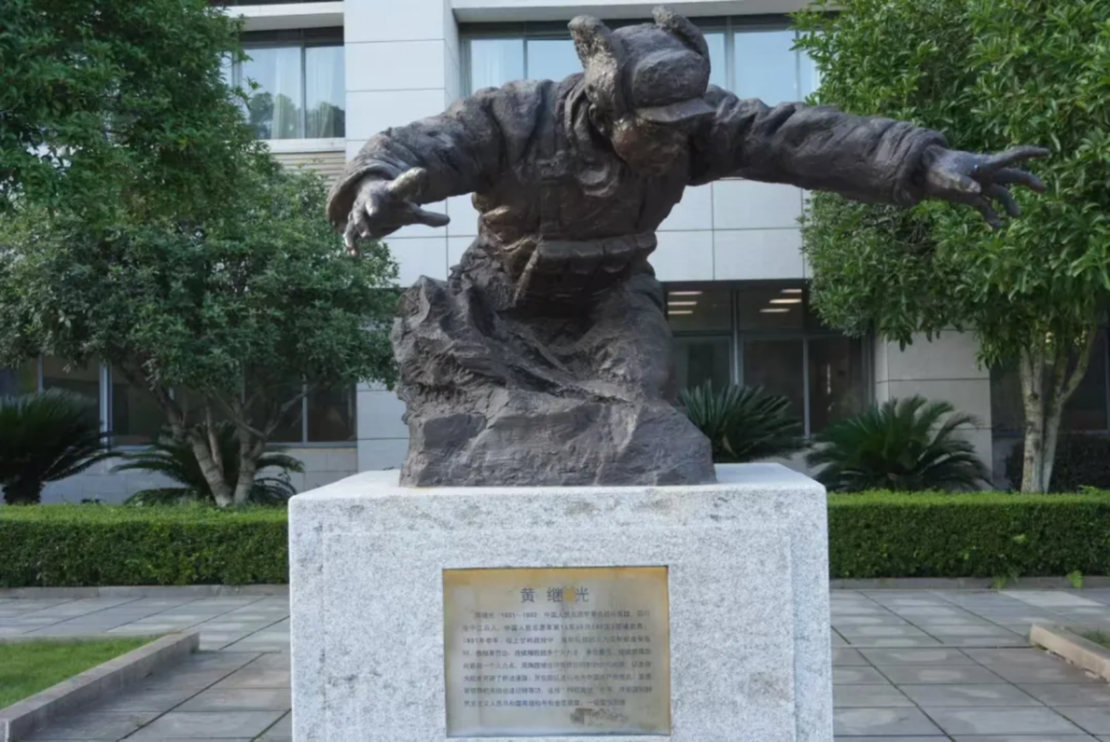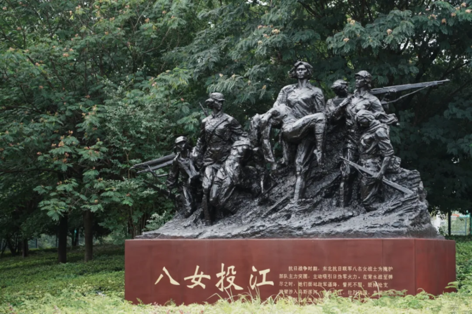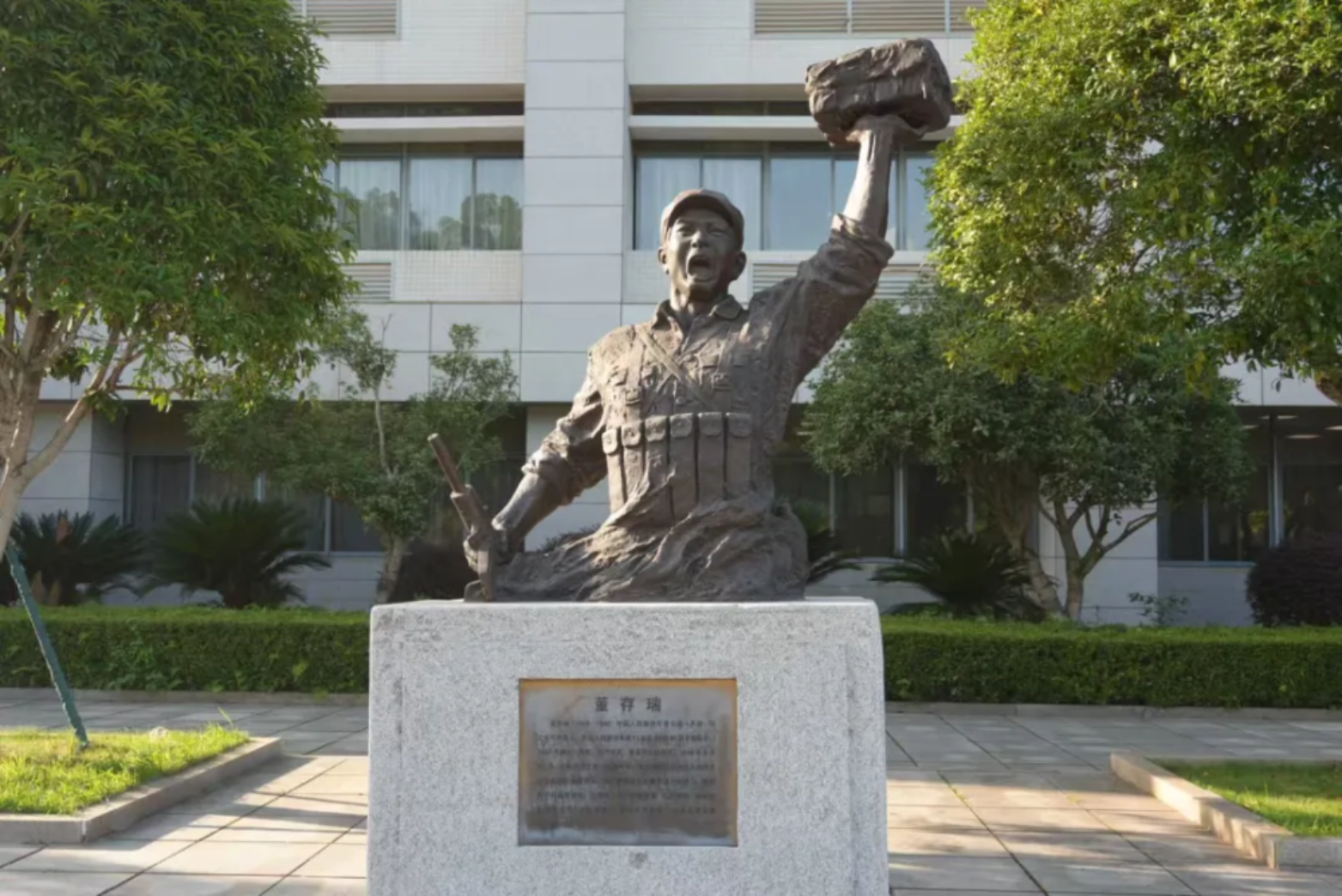 校史墙的铭文,队列旁的群雕