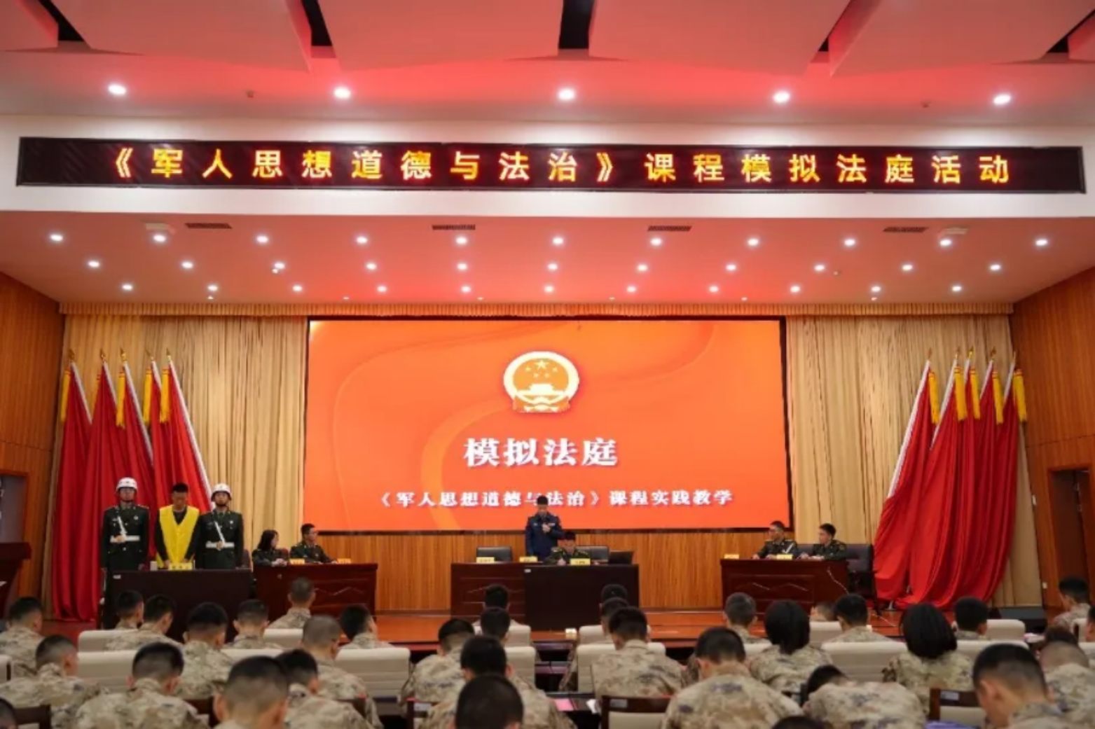 12月4日是我国第十一个“国家宪法日”,为了大力弘扬宪法精神,维护宪法权威,推动法治军营建设,国防科大《军人思想道德与法治》课程团队邀请长沙军事法院、军事检察院司法专家来到教学现场,结合真实案例,设计指导了一场别开生面的“模拟法庭“教学活动,让学员们在逼真的场景下体验刑事案件审判过程。
