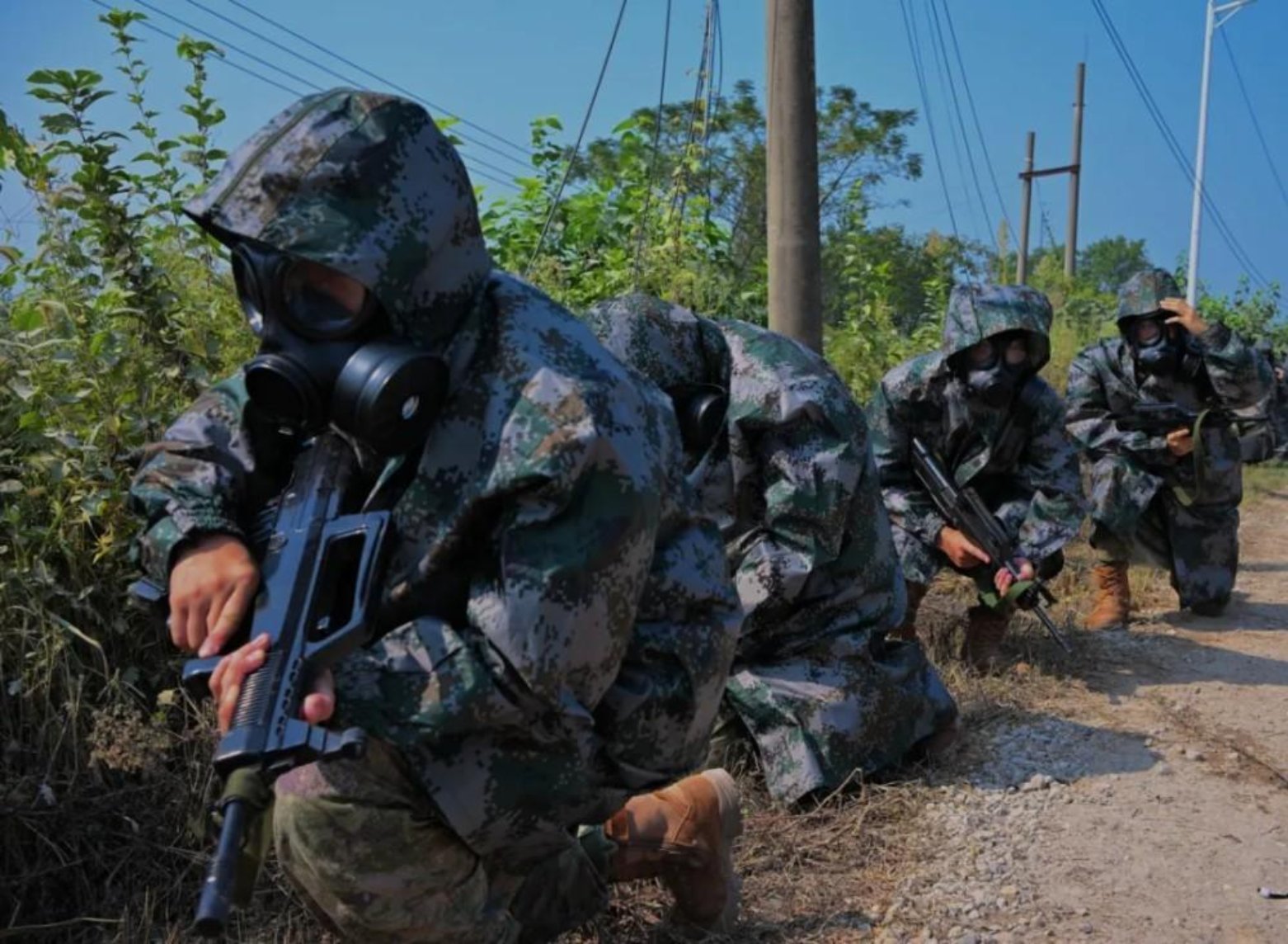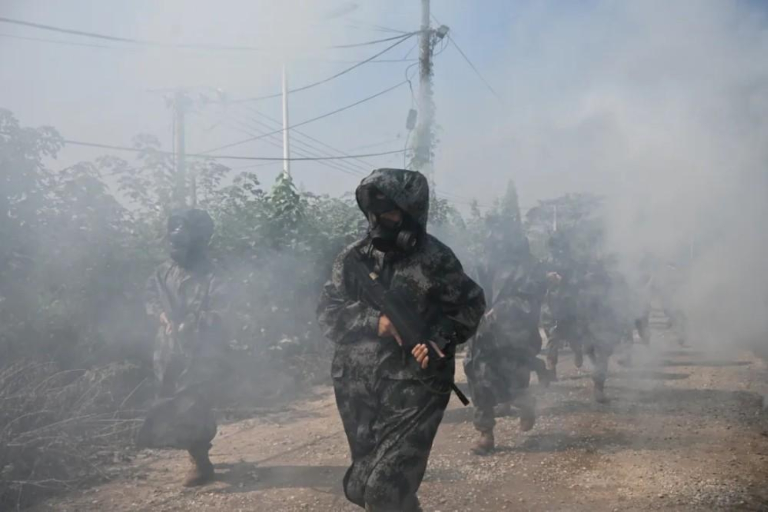演练途中,随着几枚炮弹突然炸响,道路上弥漫起“有毒”烟雾。尖兵班立即停止前进,就地疏散隐蔽,并穿戴防护器材,动作迅速、一气呵成,迅速查明情况,为后续部队开辟通路。