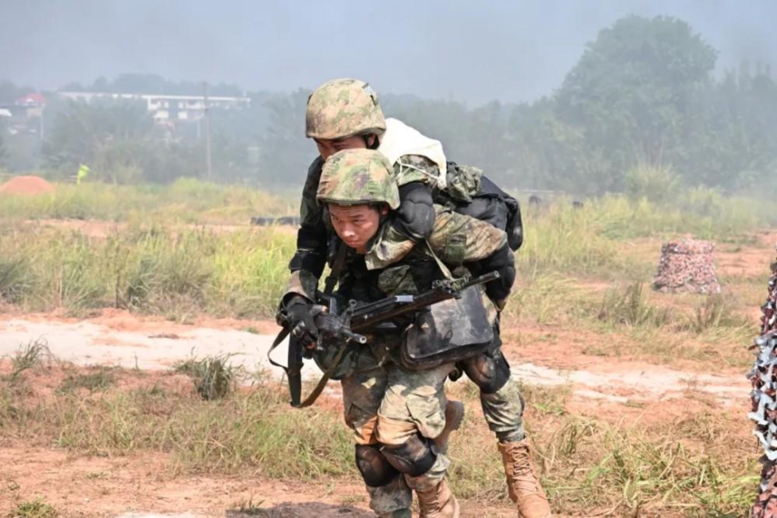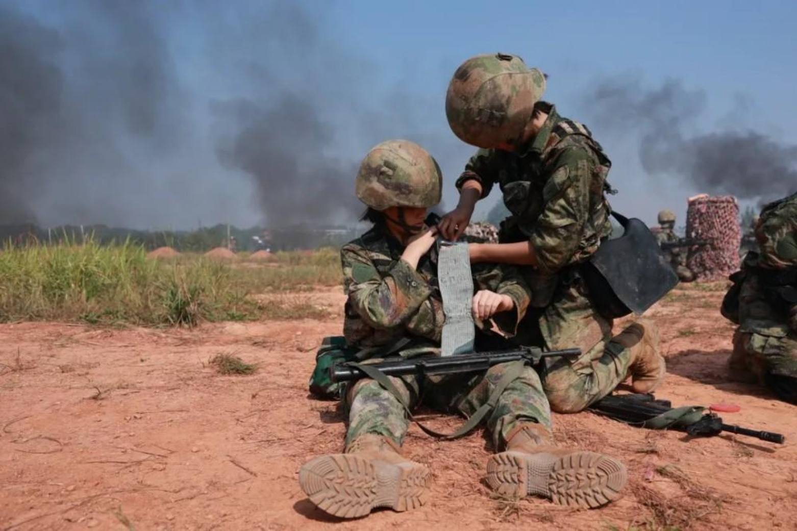“出现人员伤亡,迅速组织战伤救护!”接指挥员通报,卫生员利用隐蔽地形对伤员展开救治,熟练地进行止血包扎、骨折处理等急救处理,并把“伤员”运送到安全区域。