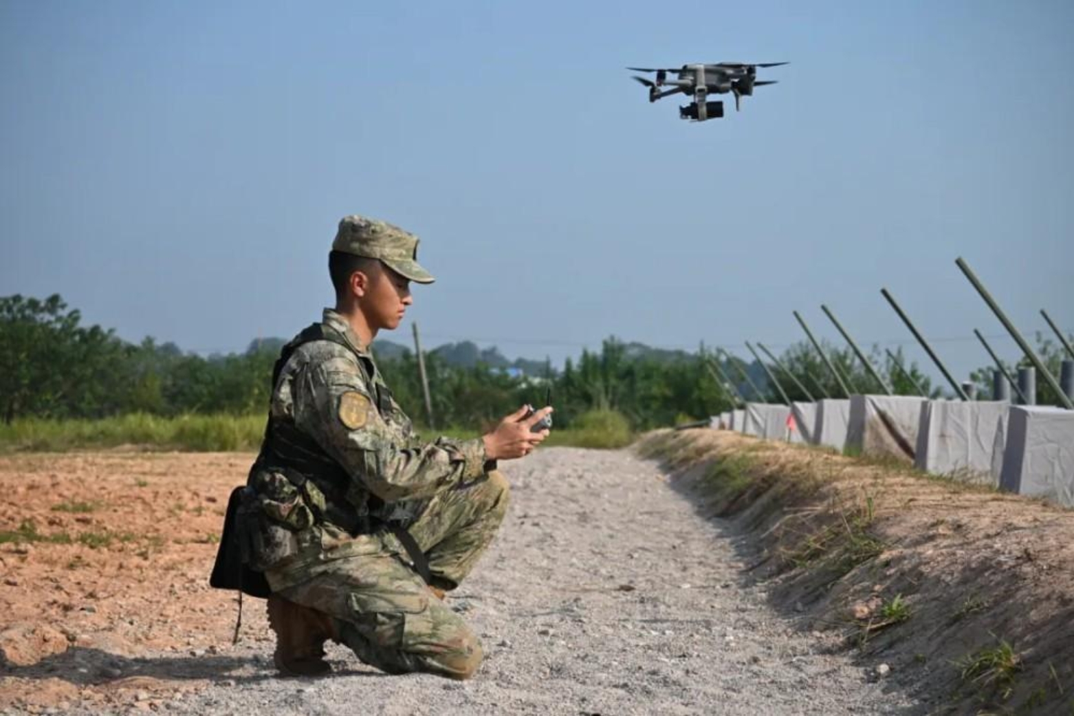 机动途中,指挥员接到尖兵班报告。“敌”残部形成步机封锁区,企图迟滞我方行动。指挥员指挥部队占领一线阵地,派出无人机对敌火力点实施侦察并投弹摧毁。