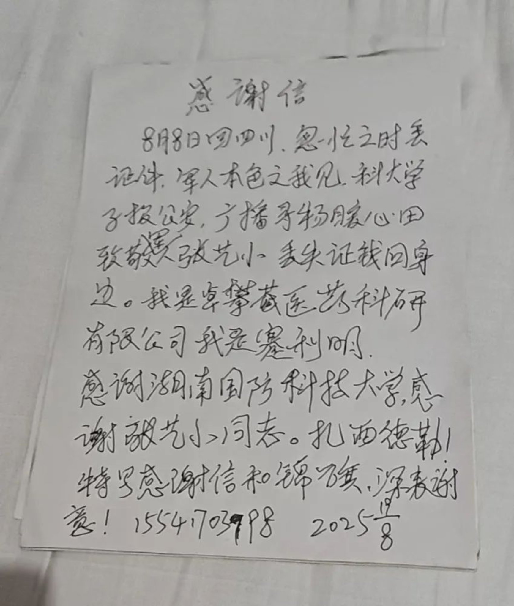 几天后,大爷特意打来电话,高兴地告知物品已被找到:“多亏了张艺小同学冷静专业的帮助!感谢国防科技大学培养出这么好的学生!”