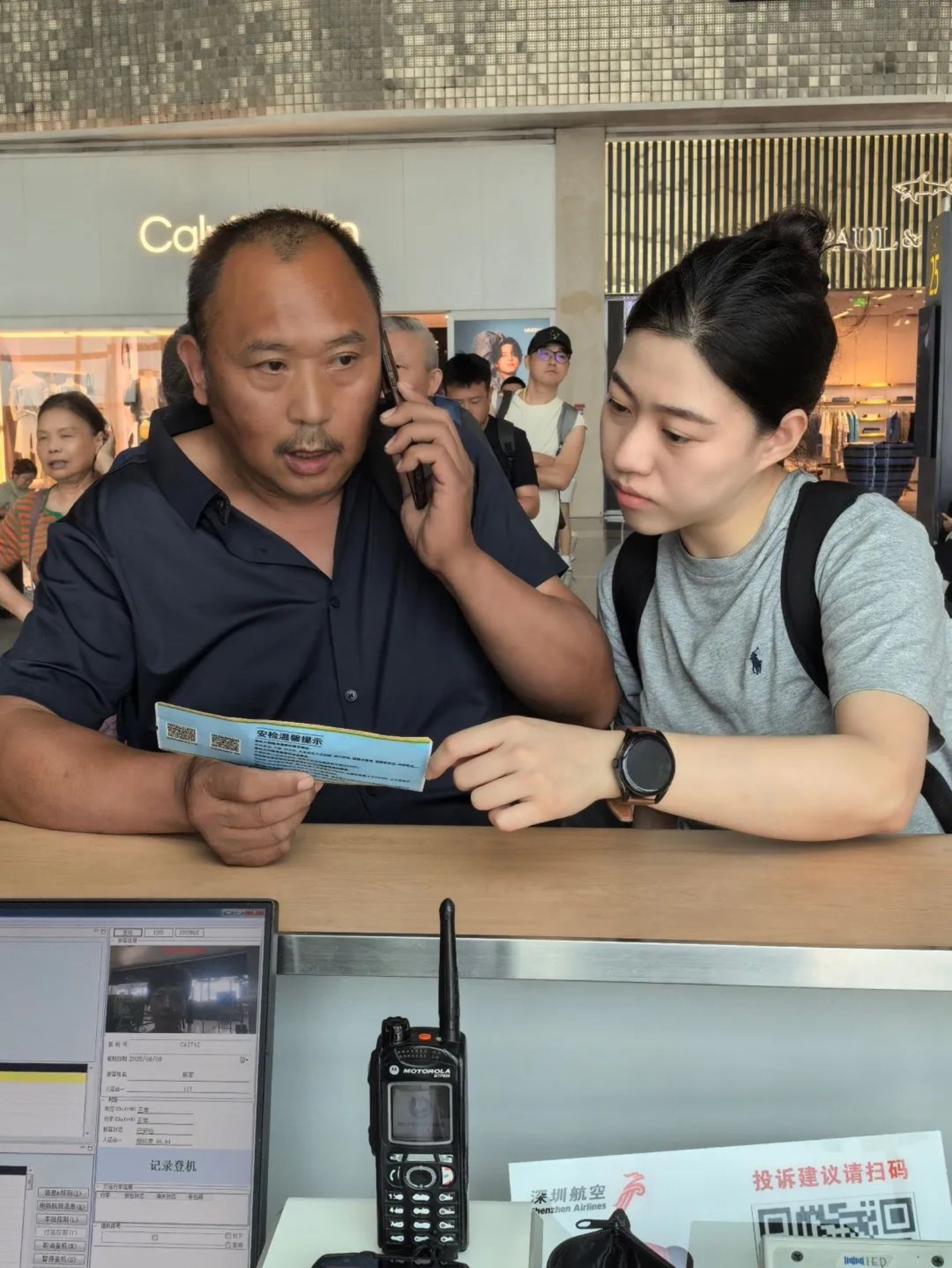 夏季的沈阳桃仙机场正值暑运高峰,候机厅内人潮涌动,空气闷热。一位大爷独自站在人群中,神色慌张、手足无措——他不慎将装着贵重物品的文件夹遗失了。一名背着双肩包的年轻姑娘快步走近:“大爷,您是不是遇到困难了?”
