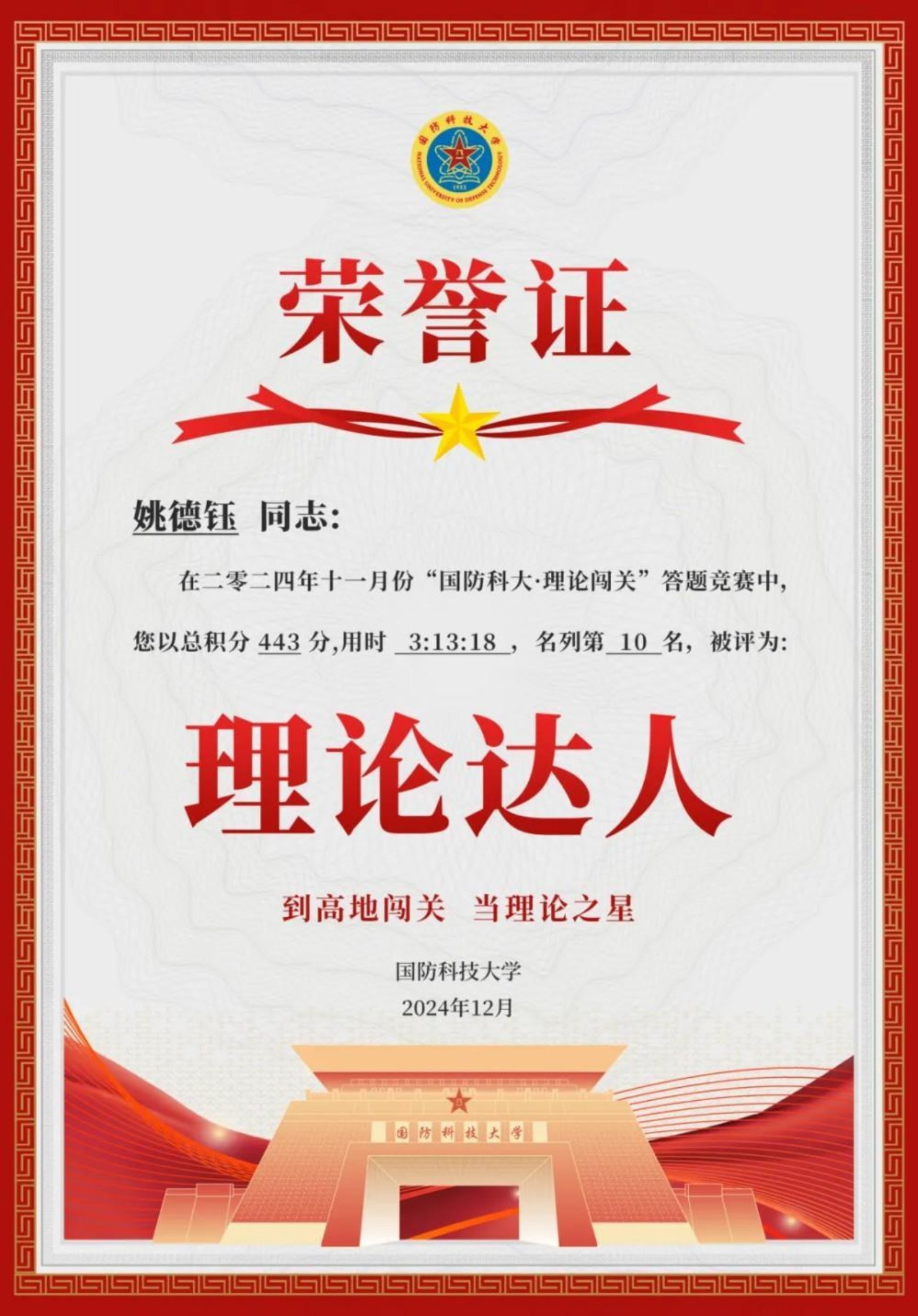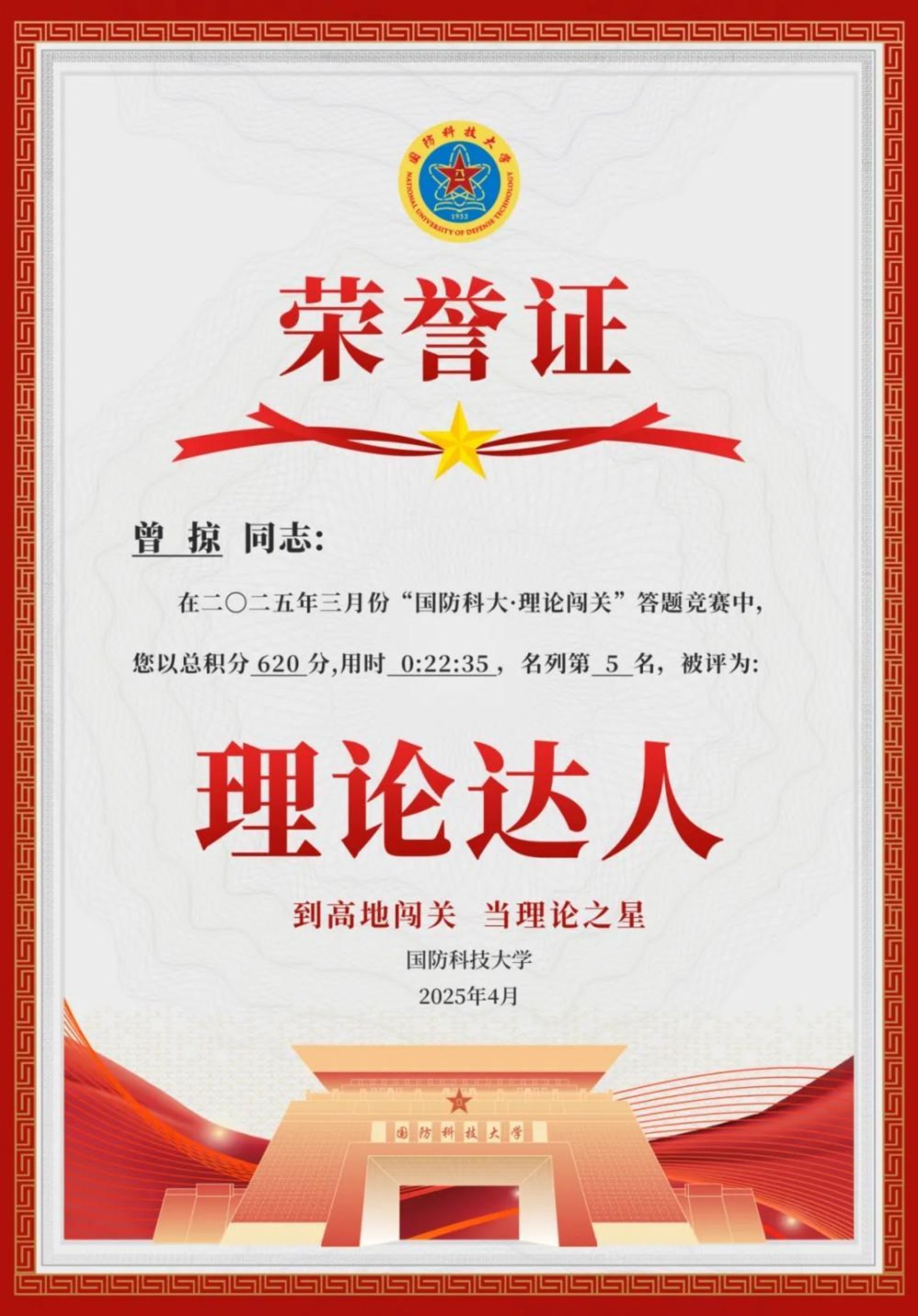 理论是行动的先导,思想是前进的旗帜。在强军兴军的时代浪潮中,国防科技大学以“理论闯关”为抓手,以“理论达人”培育为载体,将理论武装融入人才培养全过程,不仅让党的创新理论在青年学员心中落地生根,更催生出强军兴军的磅礴力量。这场生动的育人实践,深刻诠释了新时代理论武装“为何要抓、如何抓实、怎样见效”的核心命题,为全军乃至全社会理论学习提供了宝贵范本。