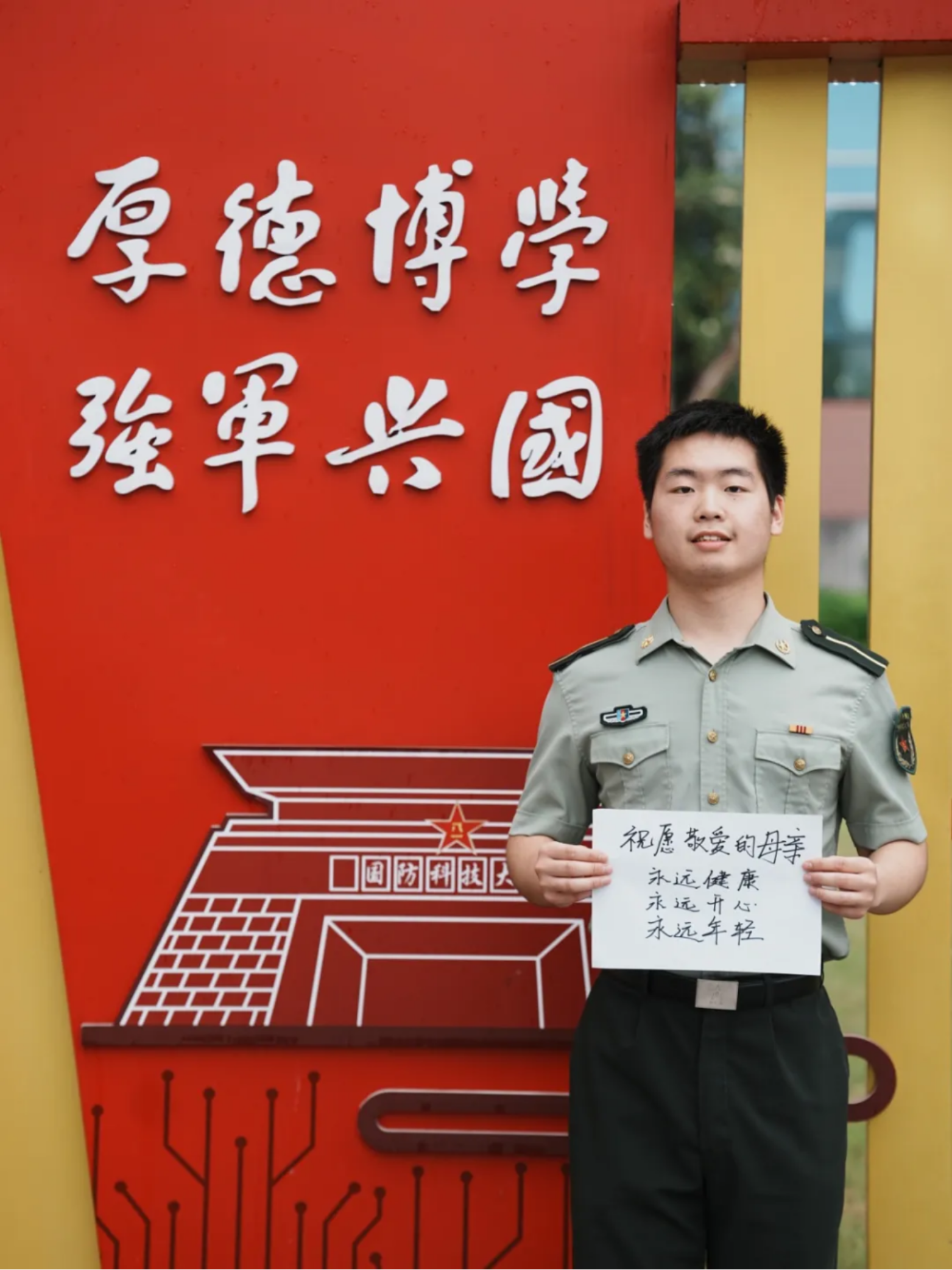 每当我在学校疲于面对高强度的训练时,脑海中浮现的总是您那温柔又坚毅的面容。您用爱为我撑起一片天,用鼓励让我勇敢前行。军校的磨砺让我更加懂得自律与担当,让我更加感激您的养育之恩。我会带着您的期望,努力拼搏,不辱使命。愿您永远健康快乐,我爱您,永远!