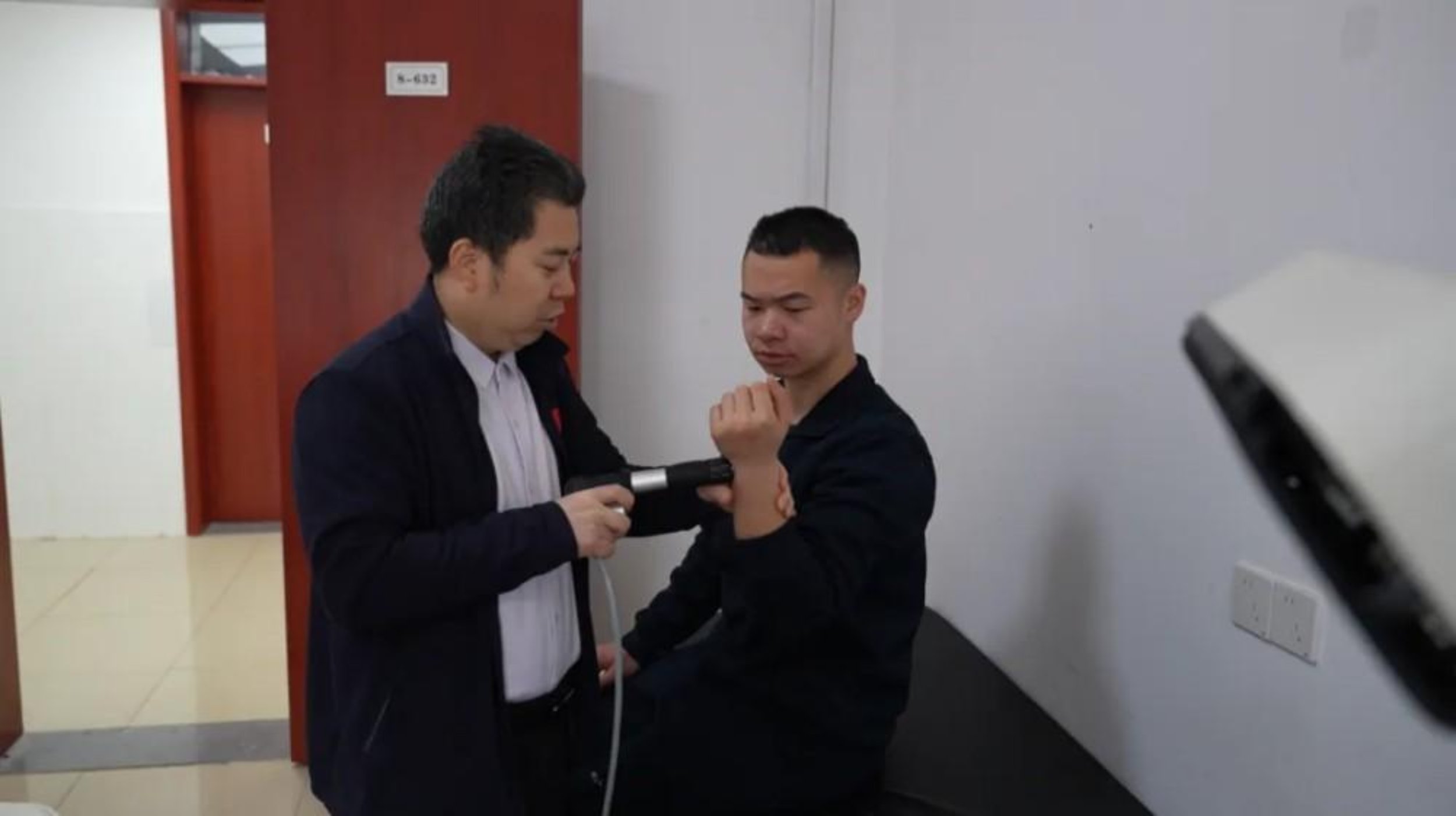 让杨哲没想到的是,大队早就关注到学员训练伤的问题,协调经费建设大队康复理疗室,邀请长沙市第一医院骨科专家魏利成教授来大队坐诊。得知杨哲的情况后,魏教授仔细检查了他的膝盖,发现是长期训练后肌肉劳损未及时恢复导致的损伤。“你这不是小问题,长期不重视的话,可能会影响后续的训练和军旅生涯。” 魏教授一边给他做理疗,一边耐心指导。