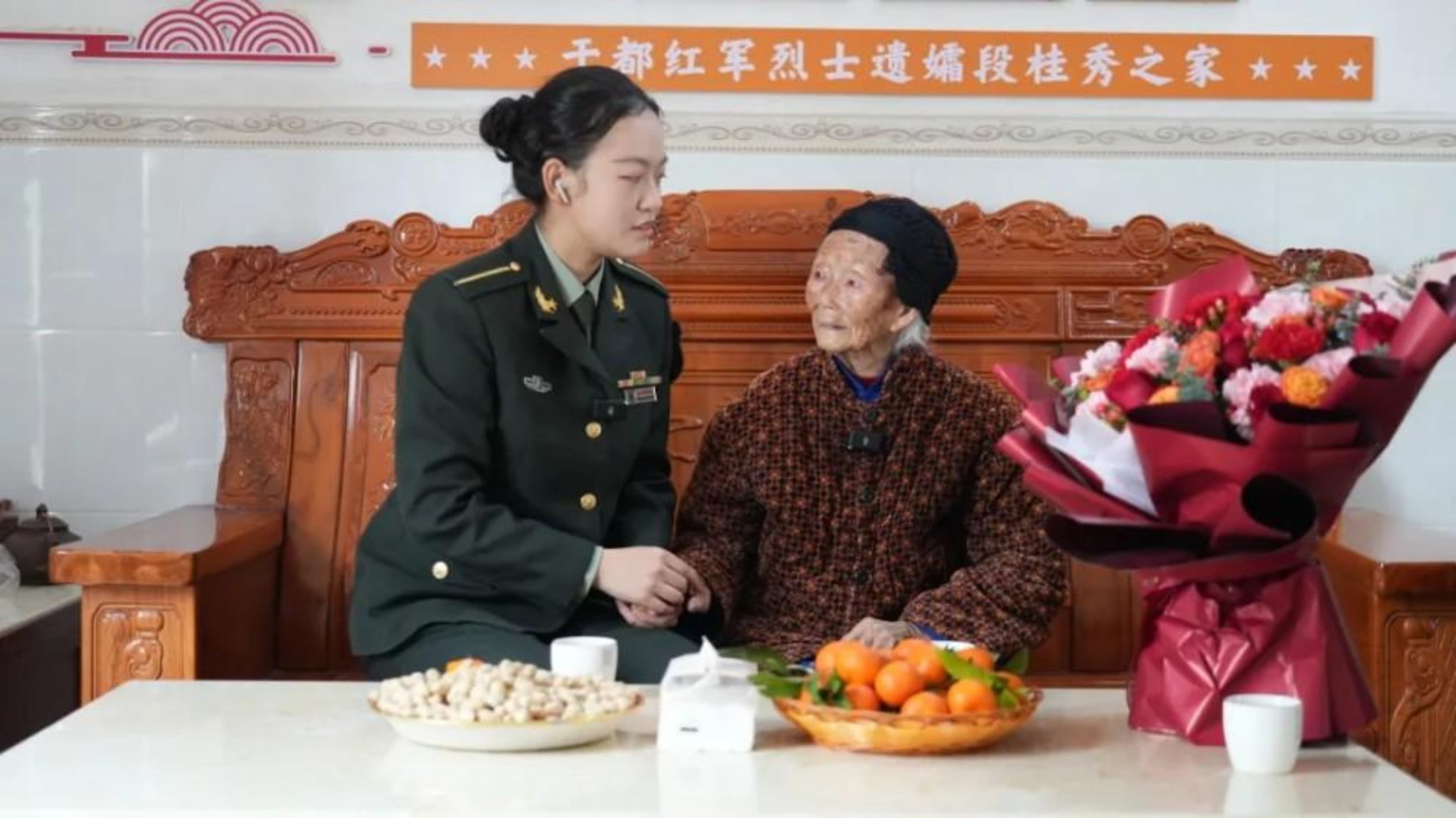 在车溪乡烈士遗孀段桂秀居所,主播在巨幅壁画《守望》前驻足讲述,108岁的段奶奶用94年的漫长等待,守护着对红军丈夫王金长的生死承诺,谱写了一曲感人至深的“守望”之歌。