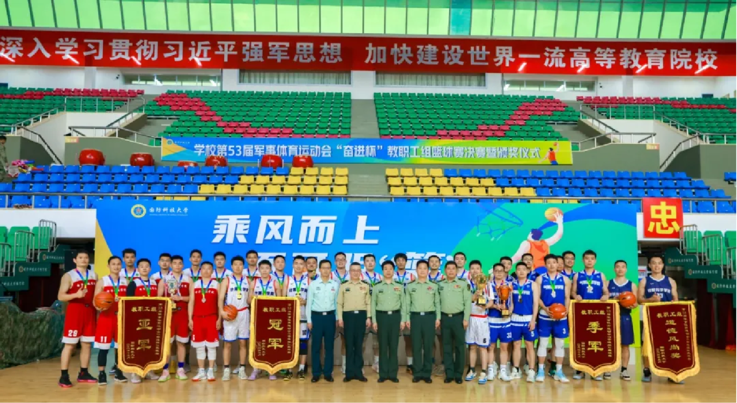 5月11日,国防科技大学举行第53届军事体育运动会“奋进杯”教职工组篮球赛决赛暨颁奖仪式。学校体育运动指导委员会主任、副政治委员兼纪委书记张战和校政治工作部领导、协办单位计算机学院领导分别为获奖队伍颁奖。