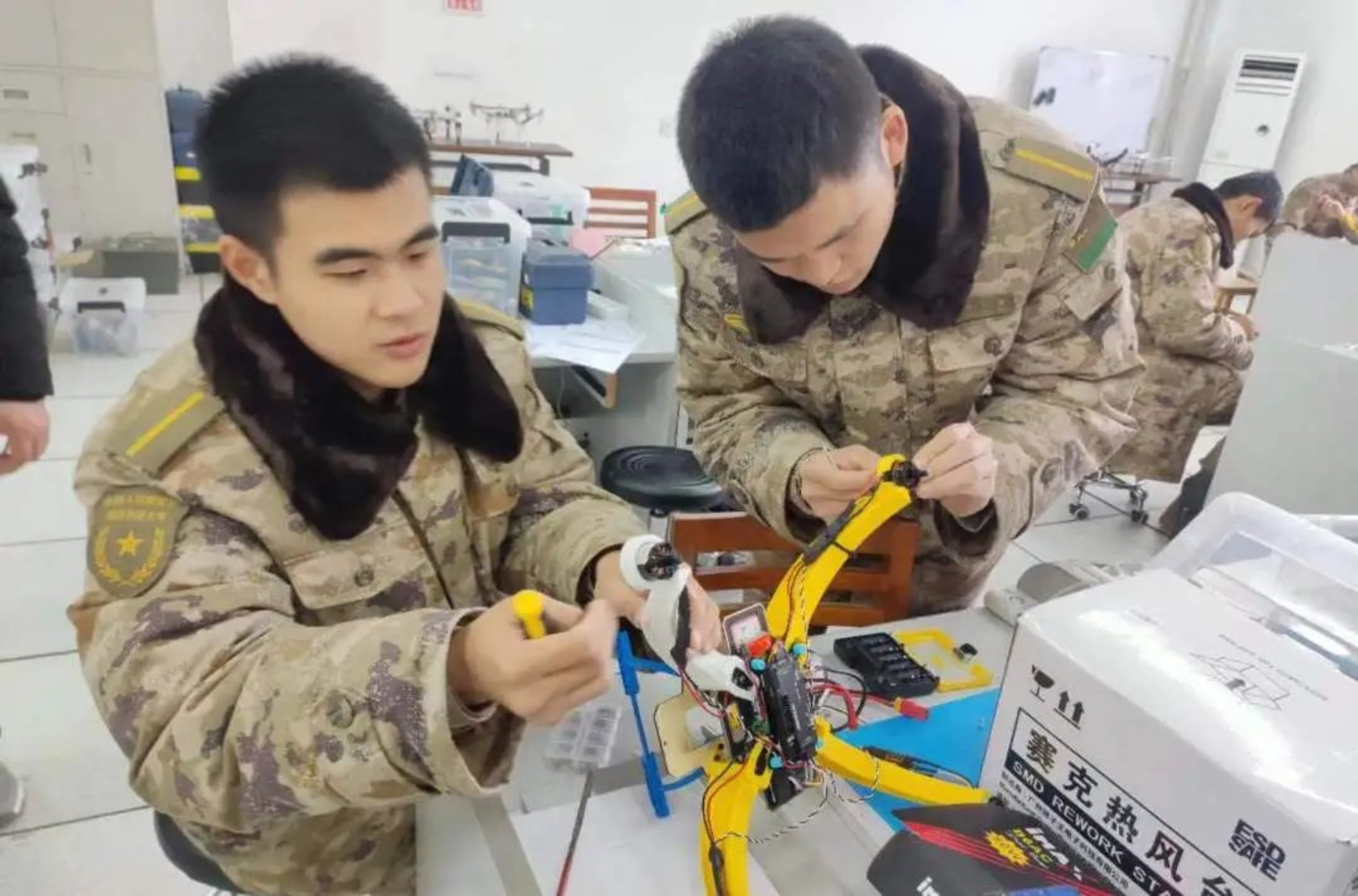 “我们组的无人机独特之处在于设计时考虑到战场的复杂环境条件,对其起落架进行了减震设计,可以有效解决无人机着陆时遭受强震动的问题。”“我们组进行了无人机机臂的可折叠式设计,便于收纳和携带。”……当被问及每小组制作无人机与其它无人机有何不同之处时,小组成员迫不及待地分享自己的观点。