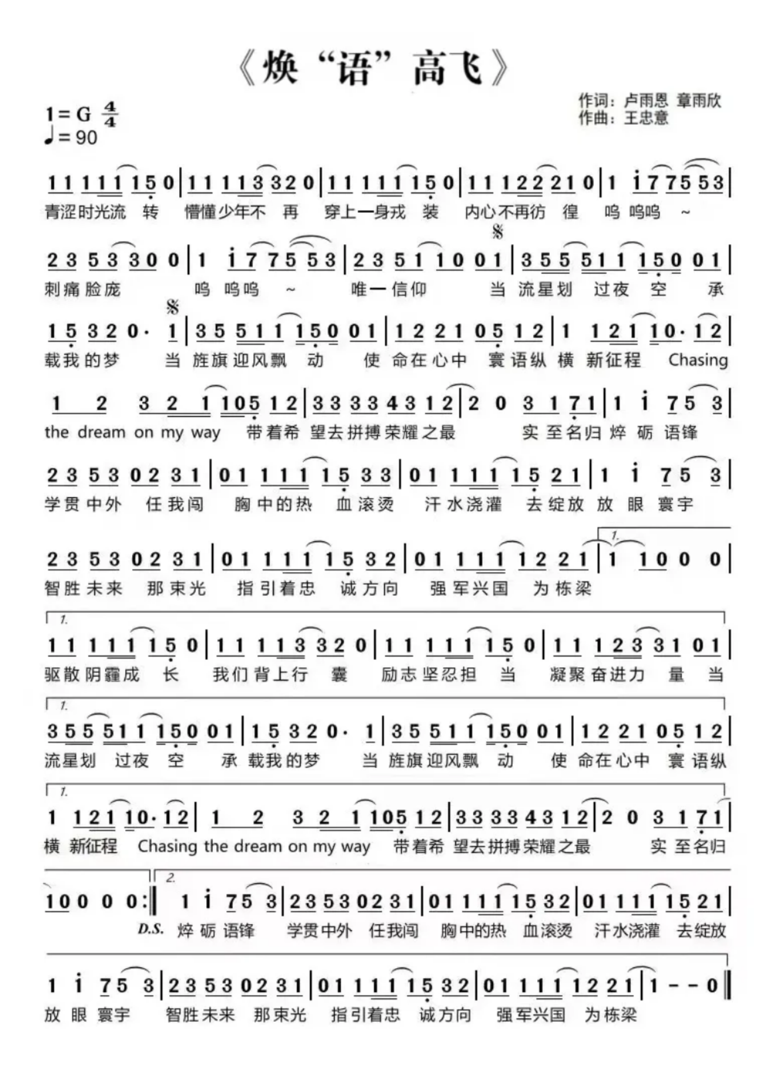 《焕“语”高飞》是外国语学院首届“世界文化发展日”暨学生节活动的主题曲,也是寰语纵横俱乐部招新的推广曲。作品以明快旋律流淌跃动,勾勒外国语学院学员以学习世界各国语言为桥梁,传播中华文化、编织文明经纬的青春志气。