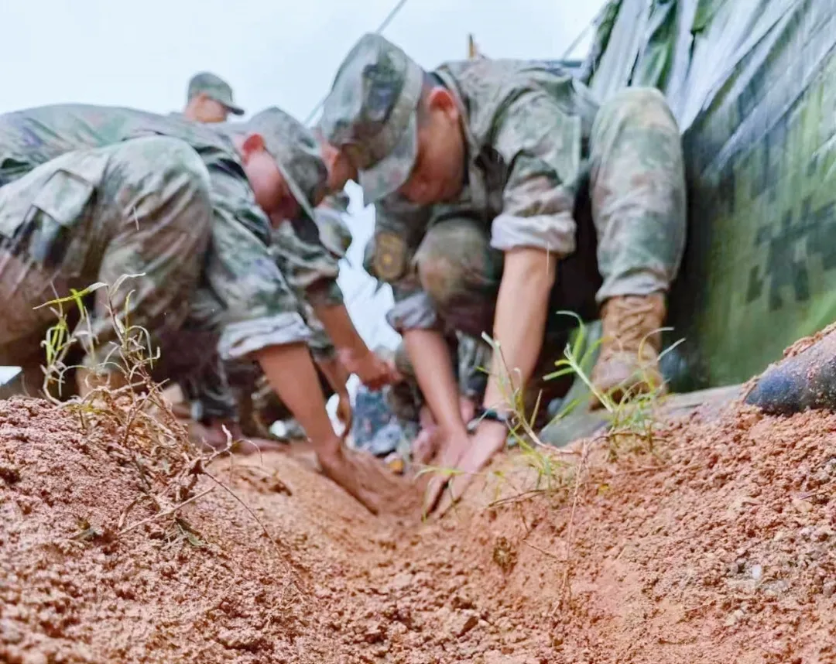 在荒野中搭帐篷 挖水渠