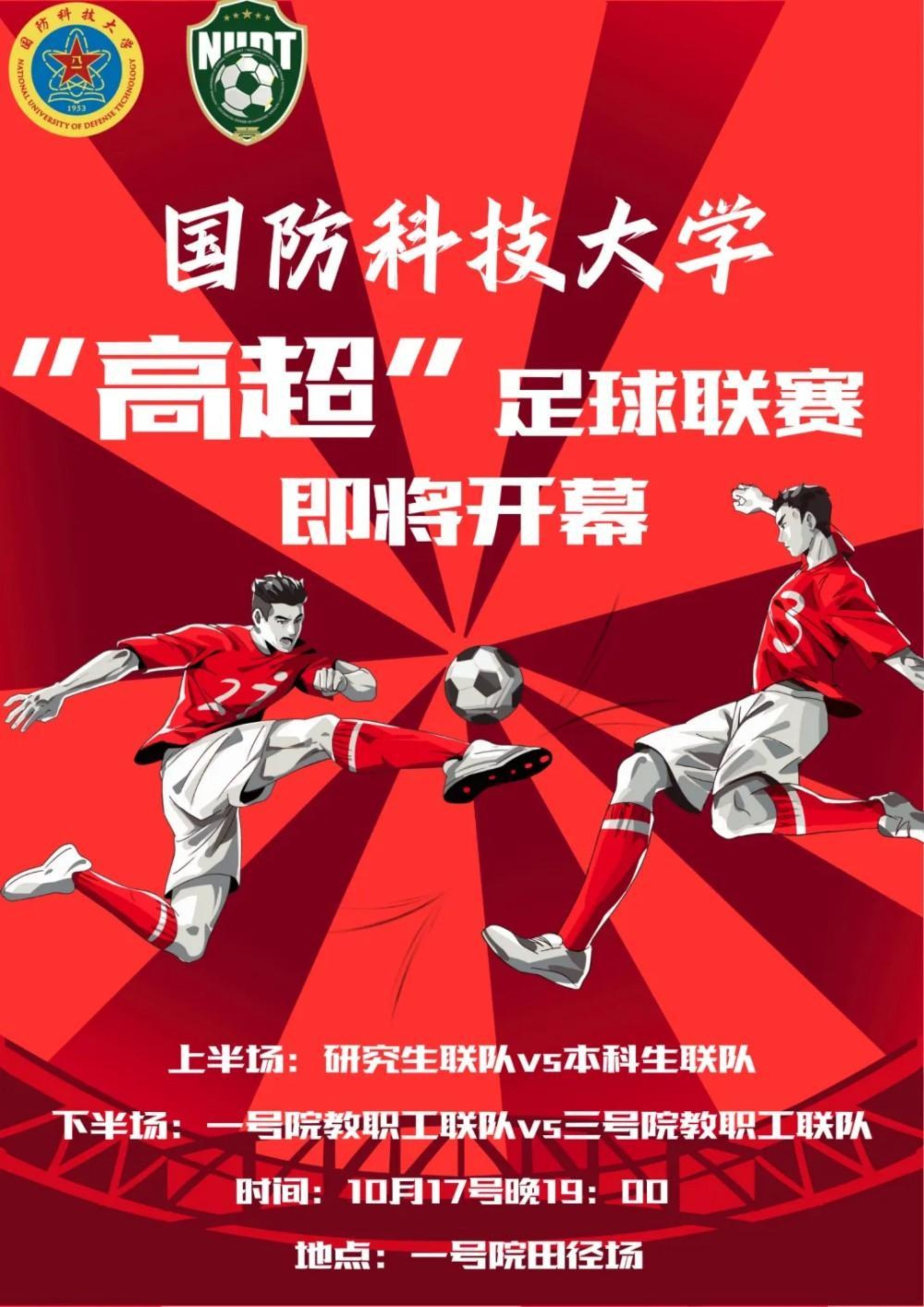 10月17日(周五)19:00,国防科技大学长沙校区一号院田径场将举办“高地奋进杯”足球联赛。