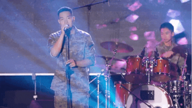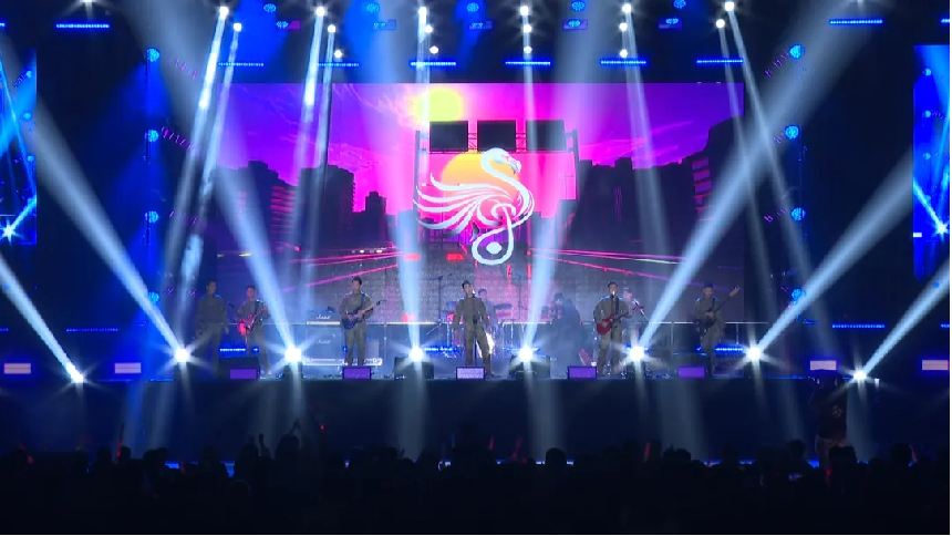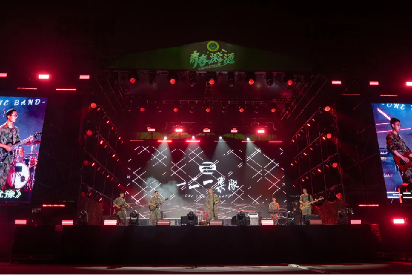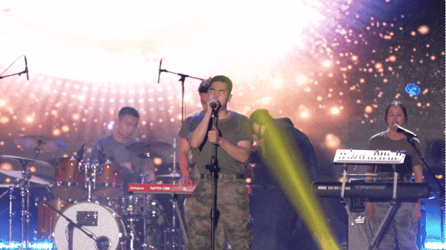 火烈鸟乐队在阵阵欢呼声中登上了舞台,歌曲《向阳花》《公路之歌》展现年轻人朝气蓬勃,愿我们在强军新征程上永远奔跑,永远热泪盈眶。